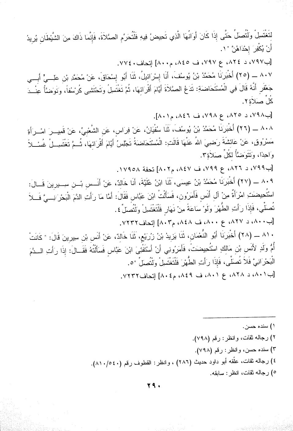 809 - (27) أَخْبَرَنَا مُحَمَّدُ بْنُ عِيسَى، ثَنَا ابْنُ عُلَيَّةَ، أَنَا خَالِدٌ، عَنْ أَنَسِ بْنِ سِيرِينَ قَالَ: اسْتُحِيضَتِ امْرَأَةٌ مِنْ آلِ أَنَسٍ فَأَمَرُونِ، فَسَأَلْتُ ابْنَ عَبَّاسٍ فَقَالَ: أَمَّا مَا رَأَتِ الدَّمَ الْبَحْرَانِيَّ فَلاَ تُصَلِّي، فَإِذَا رَأَتِ الطُّهْرَ وَلَوْ سَاعَةً مِنْ نَهَارٍ فَلْتَغْتَسِلْ وَلْتُصَلِّ (¬4).