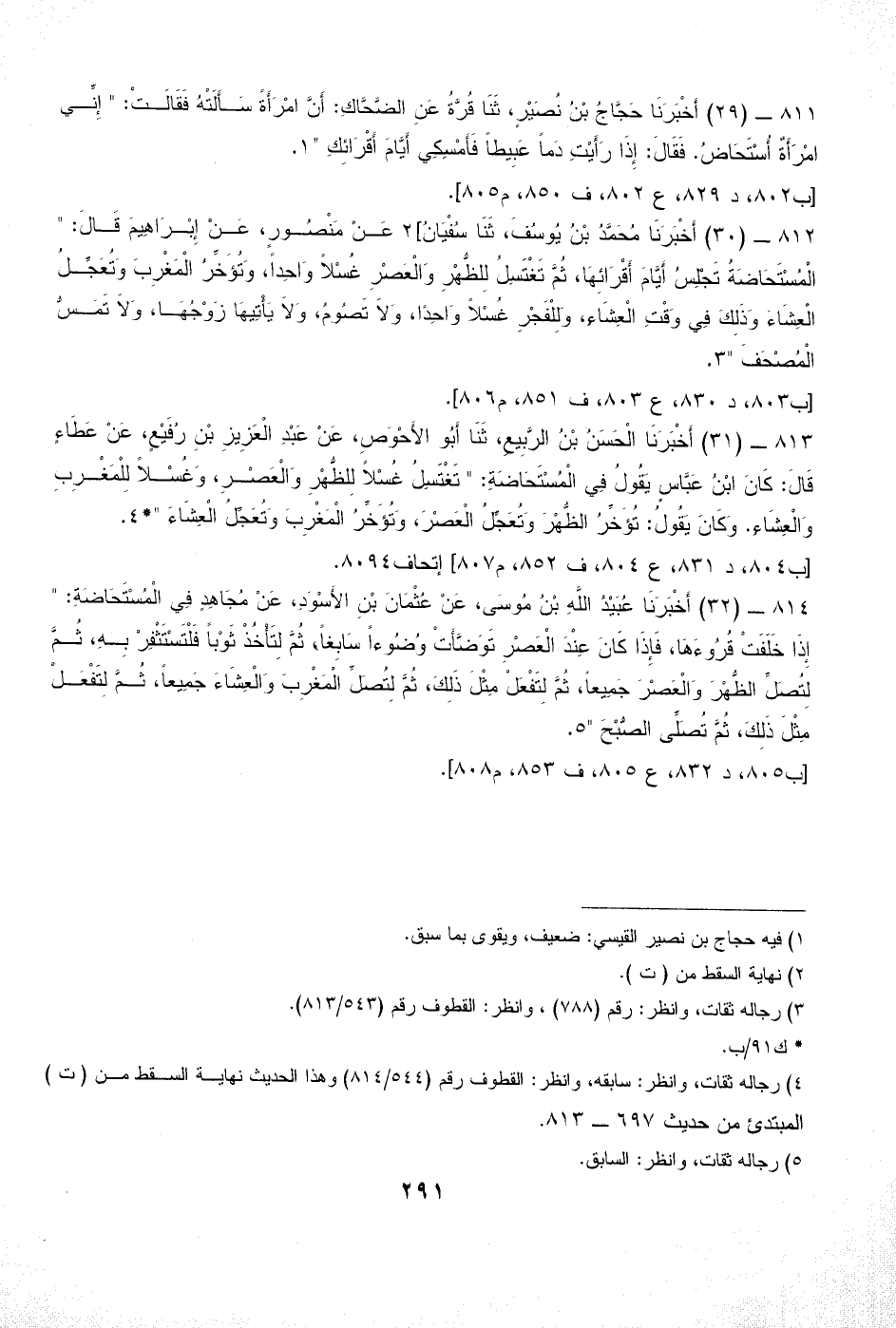 813 - (31) أَخْبَرَنَا الْحَسَنُ بْنُ الرَّبِيعِ، ثَنَا أَبُو الأَحْوَصِ، عَنْ عَبْدِ الْعَزِيزِ بْنِ رُفَيْعٍ، عَنْ عَطَاءٍ قَالَ: كَانَ ابْنُ عَبَّاسٍ يَقُولُ فِي الْمُسْتَحَاضَةِ: " تَغْتَسِلُ غُسْلاً لِلظُّهْرِ وَالْعَصْرِ، وَغُسْلاً لِلْمَغْرِبِ وَالْعِشَاءِ. وَكَانَ يَقُولُ: تُؤَخِّرُ الظُّهْرَ وَتُعَجِّلُ الْعَصْرَ، وَتُؤَخِّرُ الْمَغْرِبَ وَتُعَجِّلُ الْعِشَاءَ "* (¬4).