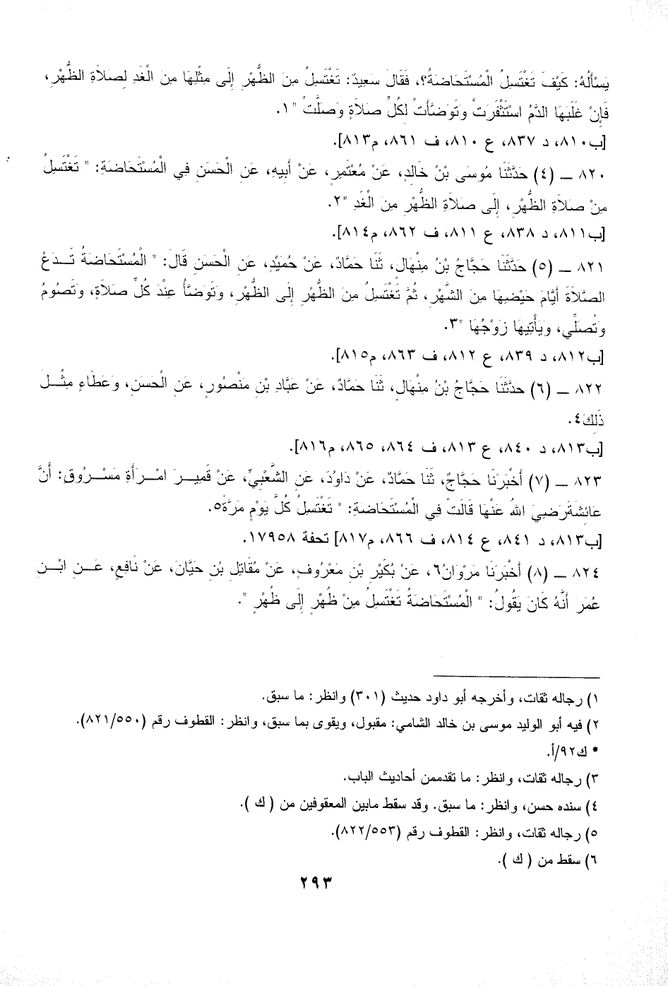 821 - (5) حَدَّثَنَا حَجَّاجُ بْنُ مِنْهَالٍ، ثَنَا حَمَّادٌ، عَنْ حُمَيْدٍ، عَنِ الْحَسَنِ قَالَ: " الْمُسْتَحَاضَةُ تَدَعُ الصَّلاَةَ أَيَّامَ حَيْضِهَا مِنَ الشَّهْرِ، ثُمَّ تَغْتَسِلُ مِنَ الظُّهْرِ إِلَى الظُّهْرِ، وَتَوَضَّأُ عِنْدَ كُلِّ صَلاَةٍ، وَتَصُومُ وَتُصَلِّي، وَيَأْتِيهَا زَوْجُهَا " (¬3).