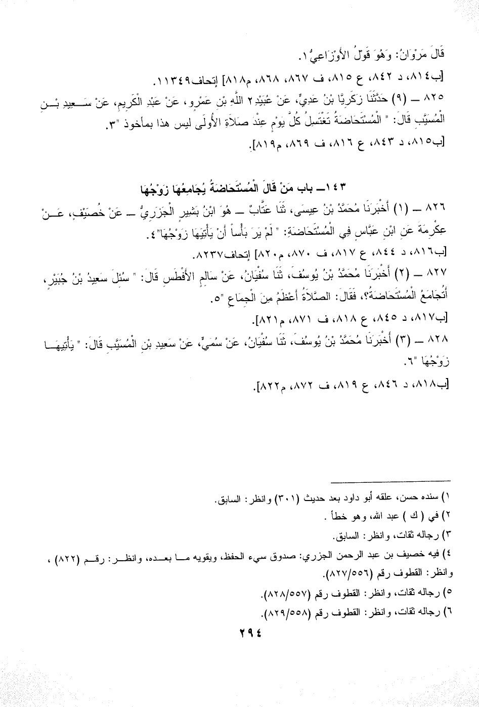 826 - (1) أَخْبَرَنَا مُحَمَّدُ بْنُ عِيسَى، ثَنَا عَتَّابٌ - هُوَ ابْنُ بَشِيرٍ الْجَزَرِيُّ - عَنْ خُصَيْفٍ، عَنْ عِكْرِمَةَ عَنِ ابْنِ عَبَّاسٍ فِي الْمُسْتَحَاضَةِ: " لَمْ يَرَ بَأْساً أَنْ يَأْتِيَهَا زَوْجُهَا" (¬4).