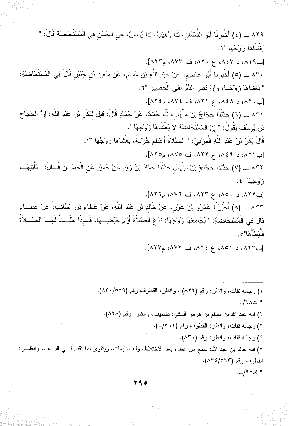 829 - (4) أَخْبَرَنَا أَبُو النُّعْمَانِ، ثَنَا وُهَيْبٌ، ثَنَا يُونُسُ، عَنِ الْحَسَنِ فِي الْمُسْتَحَاضَةِ قَالَ: " يَغْشَاهَا زَوْجُهَا " (¬1).