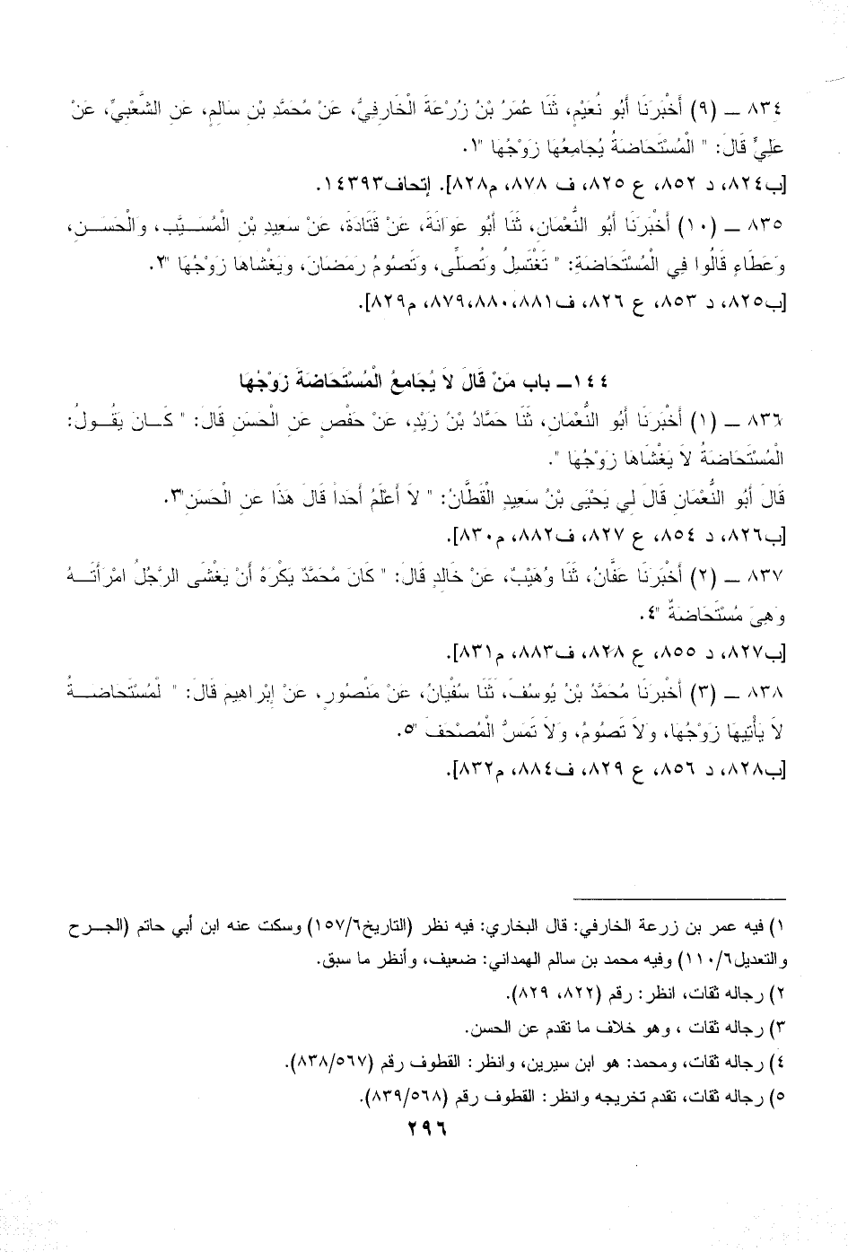 836 - (1) أَخْبَرَنَا أَبُو النُّعْمَانِ، ثَنَا حَمَّادُ بْنُ زَيْدٍ، عَنْ حَفْصٍ عَنِ الْحَسَنِ قَالَ: " كَانَ يَقُولُ: الْمُسْتَحَاضَةُ لاَ يَغْشَاهَا زَوْجُهَا ".