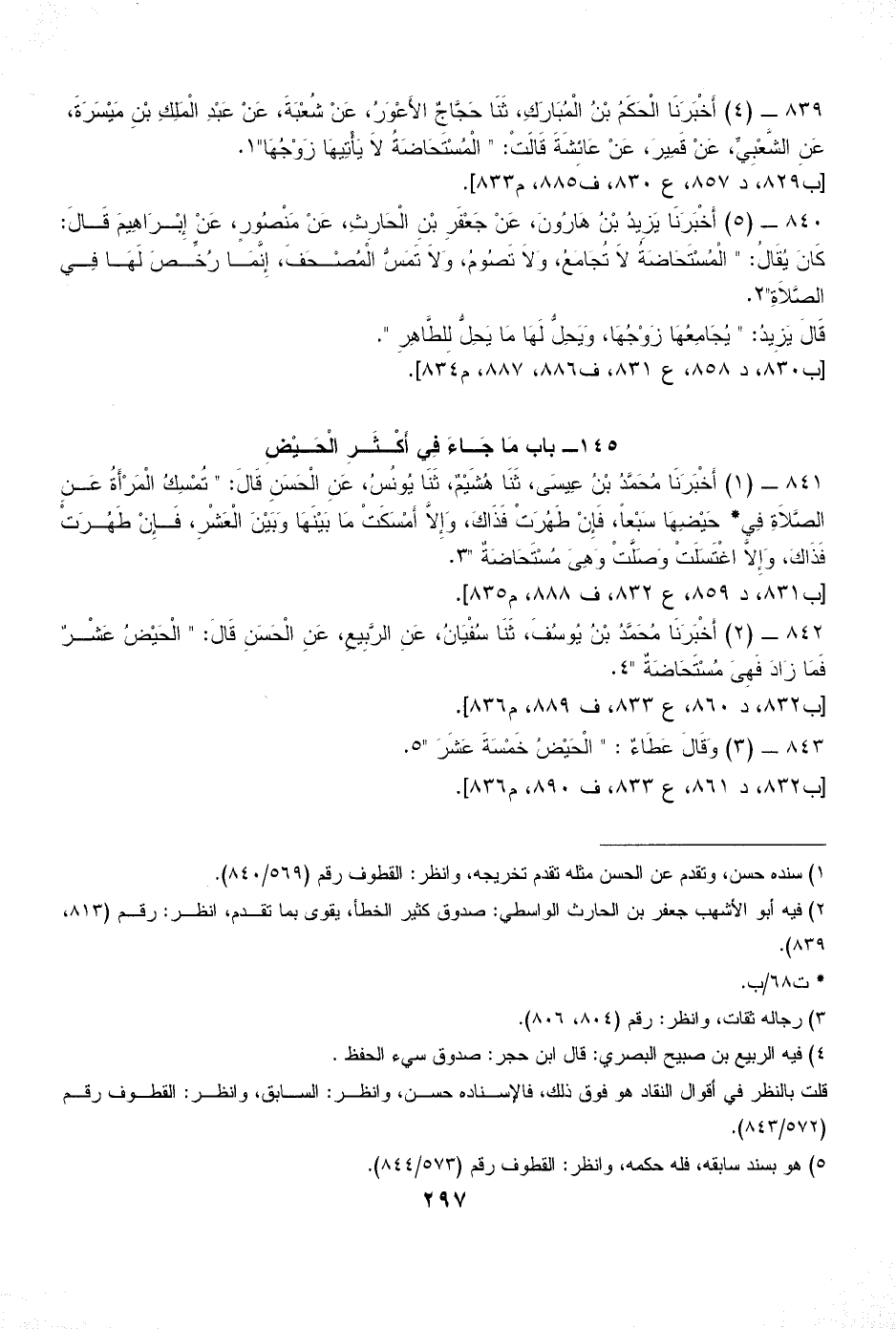 841 - (1) أَخْبَرَنَا مُحَمَّدُ بْنُ عِيسَى، ثَنَا هُشَيْمٌ، ثَنَا يُونُسُ، عَنِ الْحَسَنِ قَالَ: " تُمْسِكُ الْمَرْأَةُ عَنِ الصَّلاَةِ فِي* حَيْضِهَا سَبْعاً، فَإِنْ طَهُرَتْ فَذَاكَ، وَإِلاَّ أَمْسَكَتْ مَا بَيْنَهَا وَبَيْنَ الْعَشْرِ، فَإِنْ طَهُرَتْ فَذَاكَ، وَإِلاَّ اغْتَسَلَتْ وَصَلَّتْ وَهِىَ مُسْتَحَاضَةٌ " (¬3).