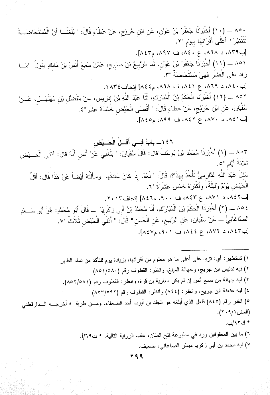 853 - (1) أَخْبَرَنَا مُحَمَّدُ بْنُ يُوسُفَ قَالَ: قَالَ سُفْيَانُ: " بَلَغَنِي عَنْ أَنَسٍ أَنَّهُ قَالَ: أَدْنَى الْحَيْضِ ثَلاَثَةُ أَيَّامٍ " (¬5).
