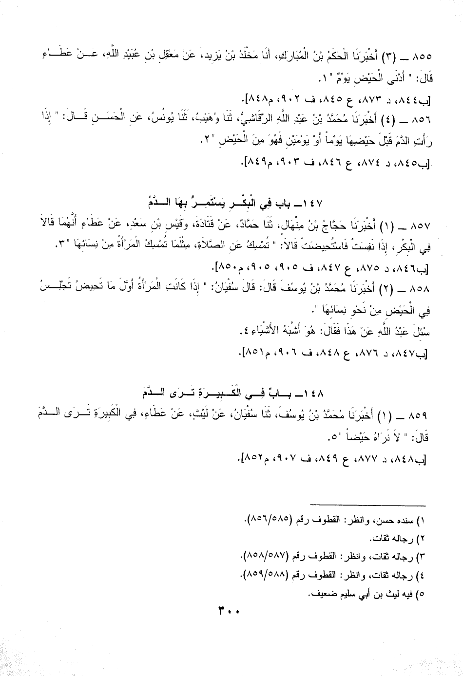 859 - (1) أَخْبَرَنَا مُحَمَّدُ بْنُ يُوسُفَ، ثَنَا سُفْيَانُ، عَنْ لَيْثٍ، عَنْ عَطَاءٍ، فِي الْكَبِيرَةِ تَرَى الدَّمَ قَالَ: " لاَ نَرَاهُ حَيْضاً " (¬5).