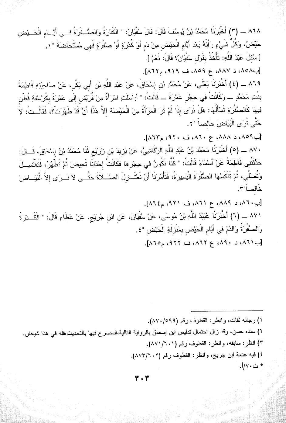 868 - (3) أَخْبَرَنَا مُحَمَّدُ بْنُ يُوسُفَ قَالَ: قَالَ سُفْيَانُ: " الْكُدْرَةُ وَالصُّفْرَةُ في أَيَّامِ الْحَيْضِ حَيْضٌ، وَكُلُّ شَيْءٍ رَأَتْهُ بَعْدَ أَيَّامِ الْحَيْضِ مِنْ دَمٍ أَوْ كُدْرَةٍ أَوْ صُفْرَةٍ فَهِى مُسْتَحَاضَةٌ " (¬1).
