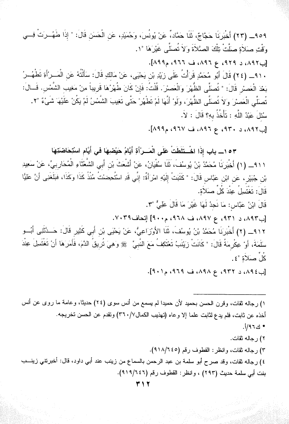 911 - (1) أَخْبَرَنَا مُحَمَّدُ بْنُ يُوسُفَ، ثَنَا سُفْيَانُ، عَنْ أَشْعَثَ بْنِ أَبِي الشَّعْثَاءِ الْمُحَارِبِيِّ، عَنْ سَعِيدِ بْنِ جُبَيْرٍ، عَنِ ابْنِ عَبَّاسٍ قَالَ: " كَتَبَتْ إِلَيْهِ امْرَأَةٌ: إِنِّي قَدِ اسْتُحِضْتُ مُنْذُ كَذَا وَكَذَا، فَبَلَغَنِى أَنَّ عَلِيًّا قَالَ: تَغْتَسِلُ عِنْدَ كُلِّ صَلاَةٍ.