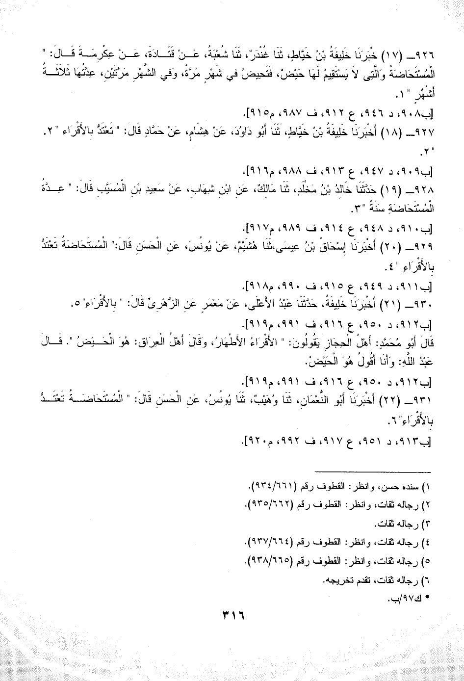 929 - (20) أَخْبَرَنَا إِسْحَاقُ بْنُ عِيسَى، ثَنَا هُشَيْمٌ، عَنْ يُونُسَ، عَنِ الْحَسَنِ قَالَ: " الْمُسْتَحَاضَةُ تَعْتَدُّ بِالأَقْرَاءِ " (¬4).