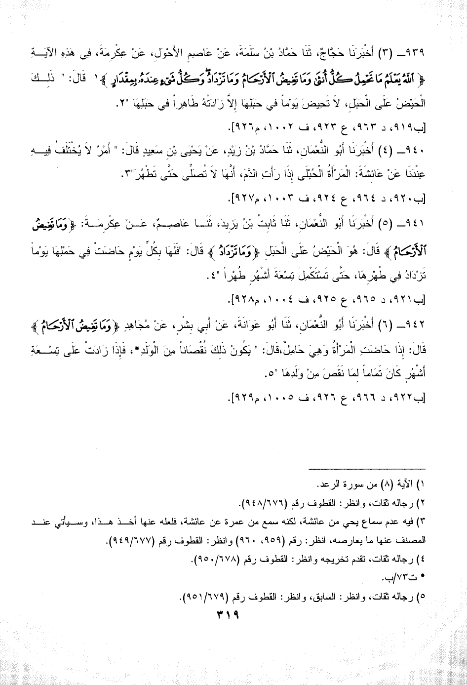 941 - (5) أَخْبَرَنَا أَبُو النُّعْمَانِ، ثَنَا ثَابِتُ بْنُ يَزِيدَ، ثَنَا عَاصِمٌ، عَنْ عِكْرِمَةَ: {وَمَا تَغِيضُ الْأَرْحَامُ} قَالَ: هُوَ الْحَيْضُ عَلَى الْحَبَلِ {وَمَا تَزْدَادُ} قَالَ: "فَلَهَا بِكُلِّ يَوْمٍ حَاضَتْ فِي حَمْلِهَا يَوْماً تَزْدَادُ فِي طُهْرِهَا، حَتَّى تَسْتَكْمِلَ تِسْعَةَ أَشْهُرٍ طُهْراً " (¬4).