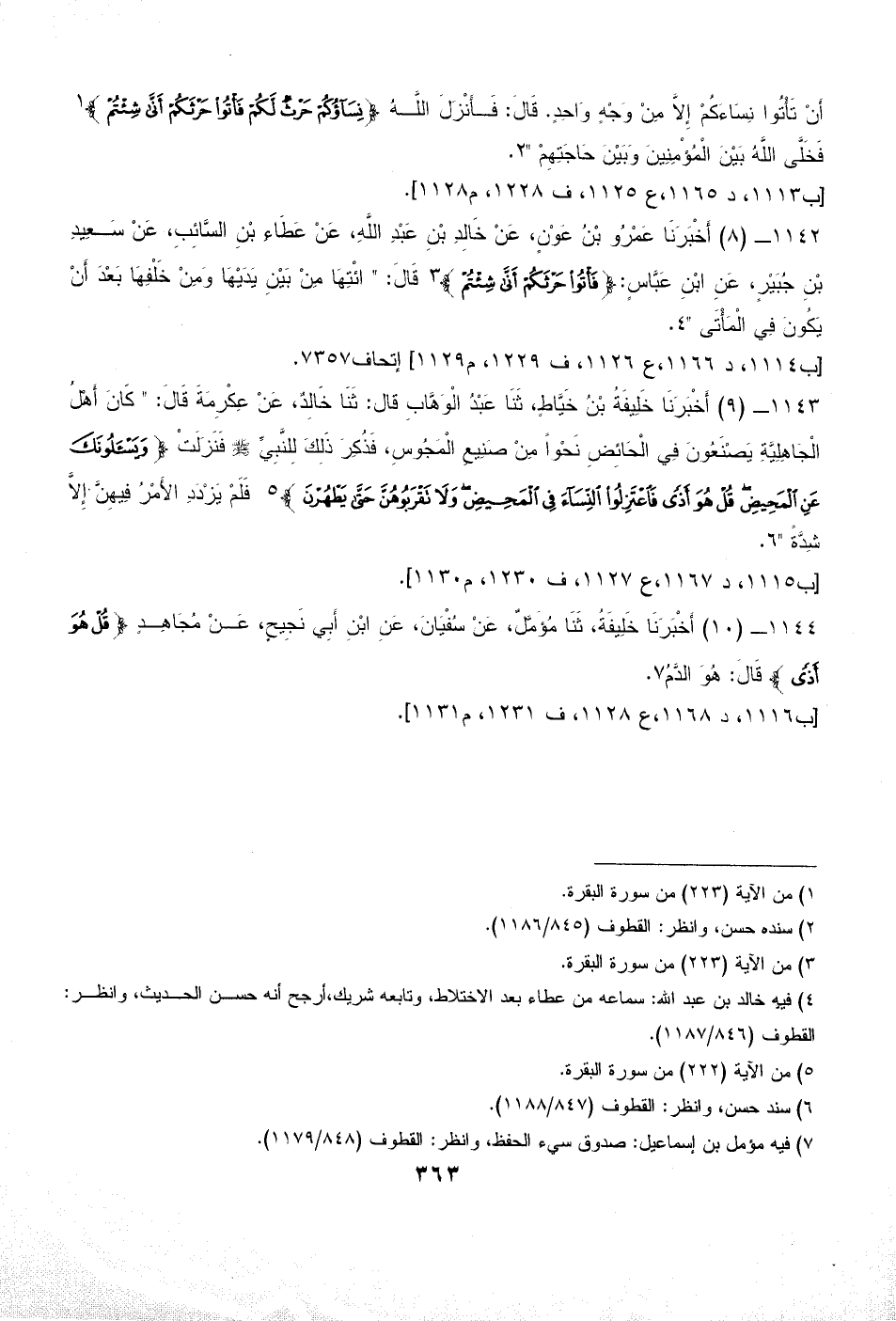 1143 - (9) أَخْبَرَنَا خَلِيفَةُ بْنُ خَيَّاطٍ، ثَنَا عَبْدُ الْوَهَّابِ قال: ثَنَا خَالِدٌ، عَنْ عِكْرِمَةَ قَالَ: " كَانَ أَهْلُ الْجَاهِلِيَّةِ يَصْنَعُونَ فِي الْحَائِضِ نَحْواً مِنْ صَنِيعِ الْمَجُوسِ، فَذُكِرَ ذَلِكَ لِلنَّبِيِّ - صلى الله عليه وسلم - فَنَزَلَتْ {وَيَسْأَلُونَكَ عَنِ الْمَحِيضِ قُلْ هُوَ أَذًى فَاعْتَزِلُوا النِّسَاءَ فِي الْمَحِيضِ وَلَا تَقْرَبُوهُنَّ حَتَّى يَطْهُرْنَ} (¬5) فَلَمْ يَزْدَدِ الأَمْرُ فِيهِنَّ إِلاَّ شِدَّةً " (¬6).
