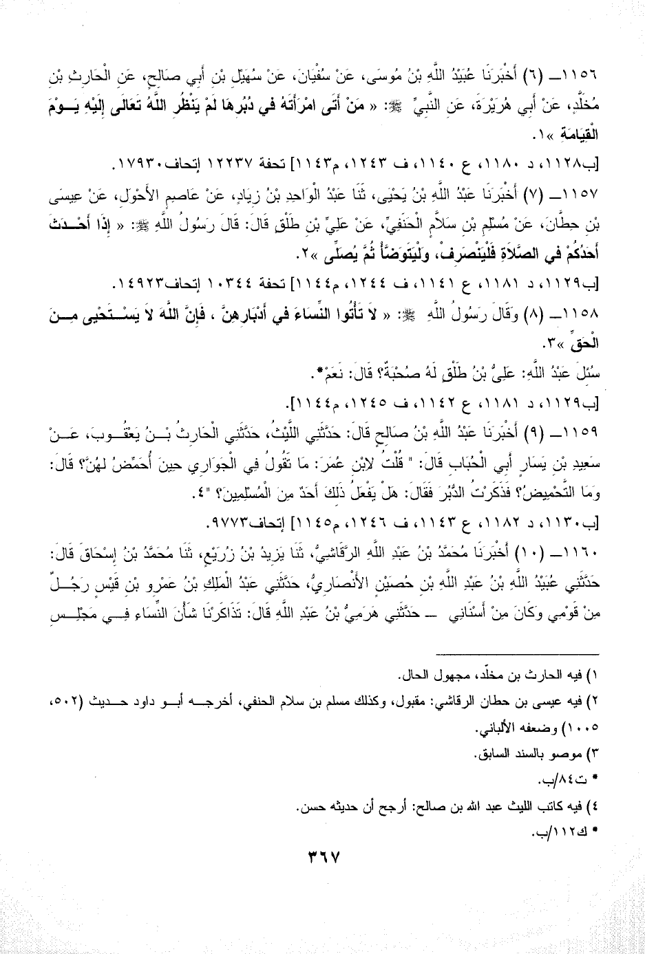 1156 - (6) أَخْبَرَنَا عُبَيْدُ اللَّهِ بْنُ مُوسَى، عَنْ سُفْيَانَ، عَنْ سُهَيْلِ بْنِ أَبِي صَالِحٍ، عَنِ الْحَارِثِ بْنِ مُخَلَّدٍ، عَنْ أَبِي هُرَيْرَةَ، عَنِ النَّبِيِّ - صلى الله عليه وسلم -: «مَنْ أَتَى امْرَأَتَهُ في دُبُرِهَا لَمْ يَنْظُرِ اللَّهُ تَعَالَى إِلَيْهِ يَوْمَ الْقِيَامَةِ» (¬1).