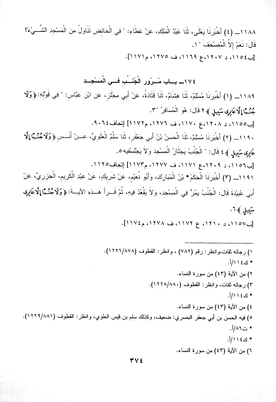 1191 - (3) أَخْبَرَنَا الْحَكَمُ* بْنُ الْمُبَارَكِ، وَأَبُو نُعَيْمٍ، عَنْ شَرِيكٍ، عَنْ عَبْدِ الْكَرِيمِ، الْجَزَرِيِّ، عَنْ أَبِي عُبَيْدَةَ قَالَ: الْجُنُبُ يَمُرُّ فِي الْمَسْجِدِ، وَلاَ يَقْعُدُ فِيهِ، ثُمَّ قَرَأَ هَذِهِ الآيَةَ: {وَلَا جُنُبًا إِلَّا عَابِرِي سَبِيلٍ} (¬6).