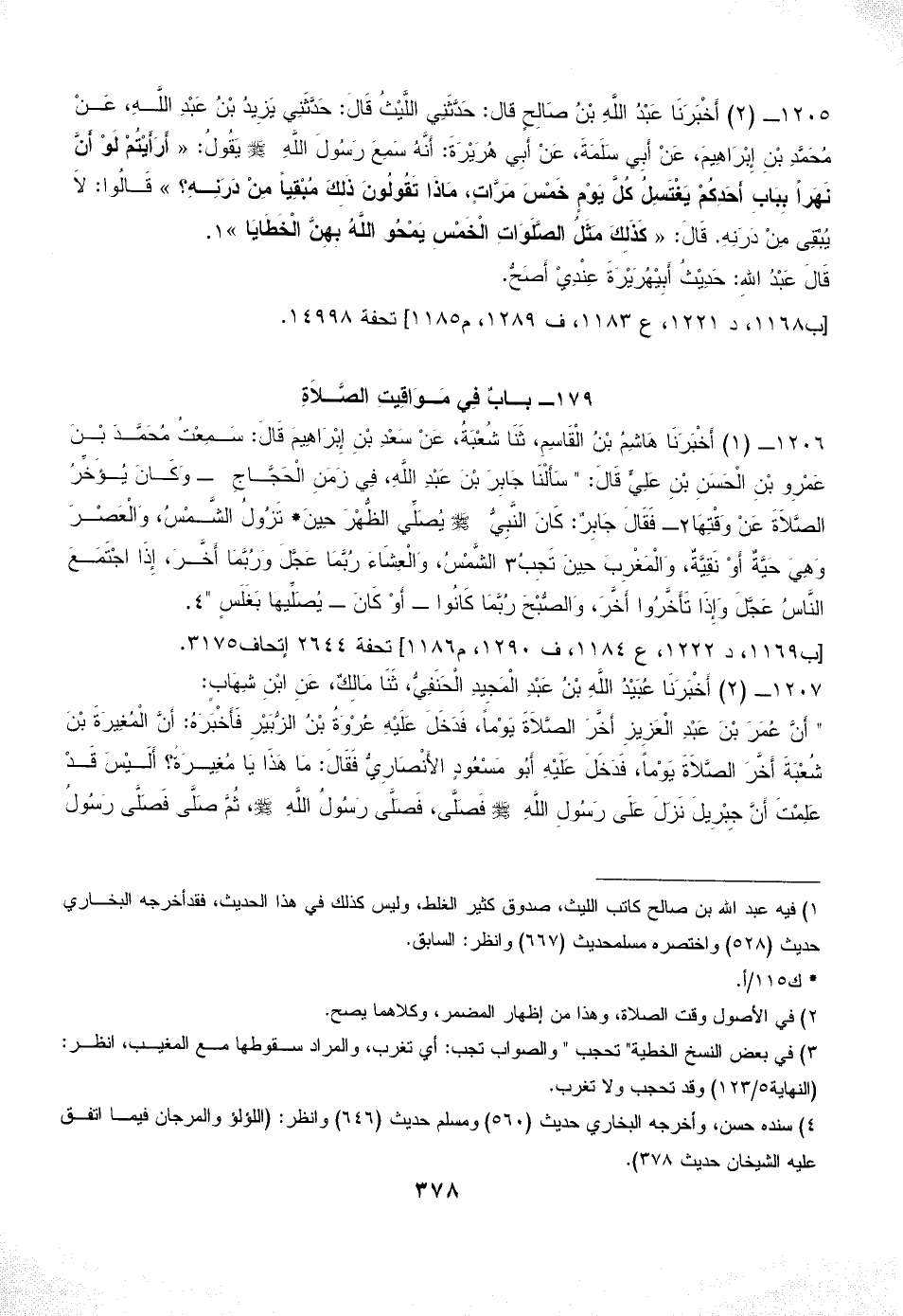 1205 - (2) أَخْبَرَنَا عَبْدُ اللَّهِ بْنُ صَالِحٍ قال: حَدَّثَنِي اللَّيْثُ قَالَ: حَدَّثَنِي يَزِيدُ بْنُ عَبْدِ اللَّهِ، عَنْ مُحَمَّدِ بْنِ إِبْرَاهِيمَ، عَنْ أَبِي سَلَمَةَ، عَنْ أَبِي هُرَيْرَةَ: أَنَّهُ سَمِعَ رَسُولَ اللَّهِ - صلى الله عليه وسلم - يَقُولُ: «أَرَأَيْتُمْ لَوْ أَنَّ نَهَراً بِبَابِ أَحَدِكُمْ يَغْتَسِلُ كُلَّ يَوْمٍ خَمْسَ مَرَّاتٍ، مَاذَا تَقُولُونَ ذَلِكَ مُبْقِياً مِنْ دَرَنِهِ؟ » قَالُوا: لاَ يُبْقِى مِنْ دَرَنِهِ. قَالَ: «كَذَلِكَ مَثَلُ الصَّلَوَاتِ الْخَمْسِ يَمْحُو اللَّهُ بِهِنَّ الْخَطَايَا» (¬1).
