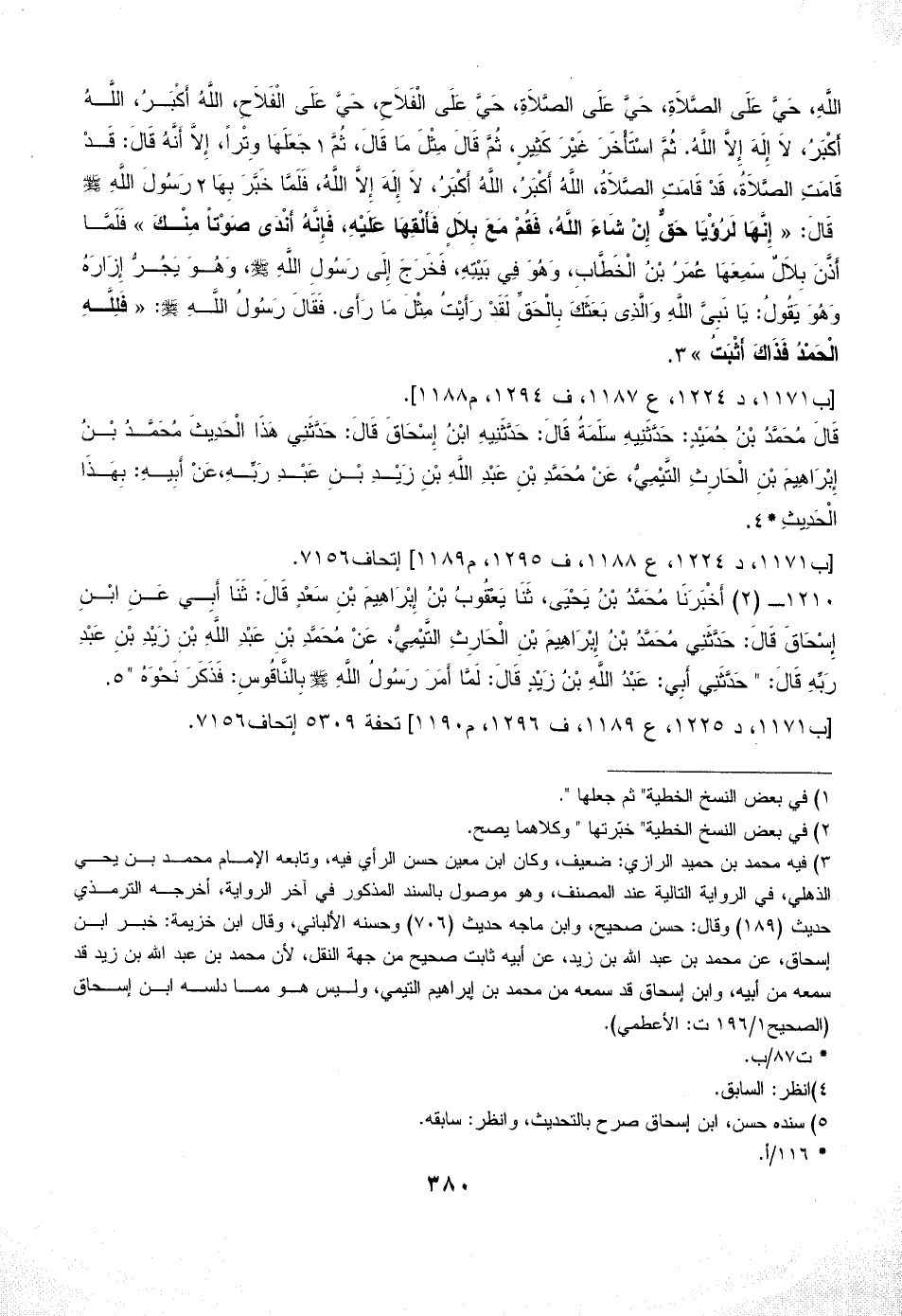 قَالَ مُحَمَّدُ بْنُ حُمَيْدٍ: حَدَّثَنِيهِ سَلَمَةُ قَالَ: حَدَّثَنِيهِ ابْنُ إِسْحَاقَ قَالَ: حَدَّثَنِي هَذَا الْحَدِيثَ مُحَمَّدُ بْنُ إِبْرَاهِيمَ بْنِ الْحَارِثِ التَّيْمِيُّ، عَنْ مُحَمَّدِ بْنِ عَبْدِ اللَّهِ بْنِ زَيْدِ بْنِ عَبْدِ رَبِّهِ، عَنْ أَبِيهِ: بِهَذَا الْحَدِيثِ* (¬4).