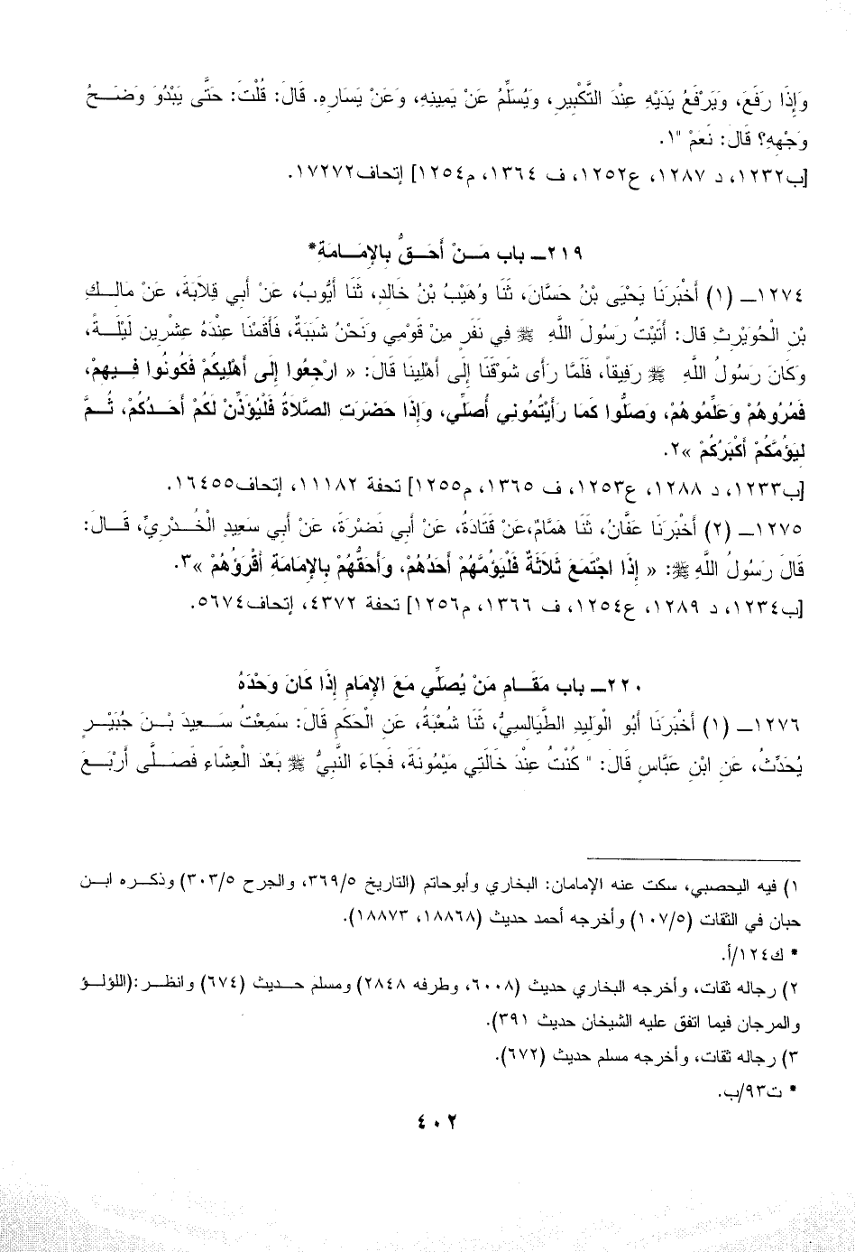 1274 - (1) أَخْبَرَنَا يَحْيَى بْنُ حَسَّانَ، ثَنَا وُهَيْبُ بْنُ خَالِدٍ، ثَنَا أَيُّوبُ، عَنْ أَبِي قِلاَبَةَ، عَنْ مَالِكِ بْنِ الْحُوَيْرِثِ قال: أَتَيْتُ رَسُولَ اللَّهِ - صلى الله عليه وسلم - فِي نَفَرٍ مِنْ قَوْمِي وَنَحْنُ شَبَبَةٌ، فَأَقَمْنَا عِنْدَهُ عِشْرِينَ لَيْلَةً، وَكَانَ رَسُولُ اللَّهِ - صلى الله عليه وسلم - رَفِيقاً، فَلَمَّا رَأَى شَوْقَنَا إِلَى أَهْلِينَا قَالَ: «ارْجِعُوا إِلَى أَهْلِيكُمْ فَكُونُوا فِيهِمْ، فَمُرُوهُمْ وَعَلِّمُوهُمْ، وَصَلُّوا كَمَا رَأَيْتُمُونِي أُصَلِّي، وَإِذَا حَضَرَتِ الصَّلاَةُ فَلْيُؤَذِّنْ لَكُمْ أَحَدُكُمْ، ثُمَّ لِيَؤُمَّكُمْ أَكْبَرُكُمْ» (¬2).