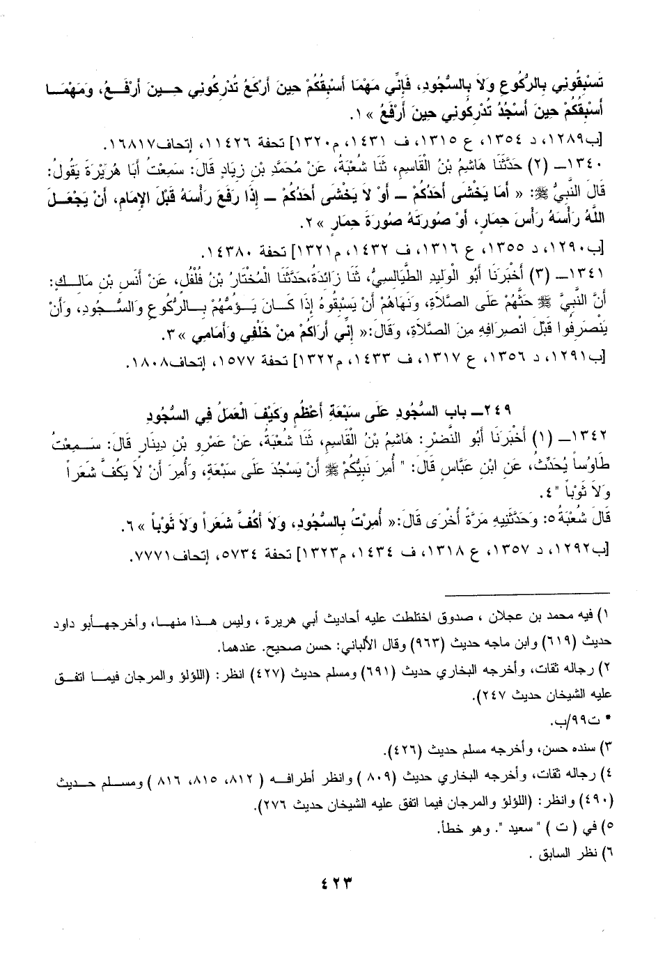 1342 - (1) أَخْبَرَنَا أَبُو النَّضْرِ: هَاشِمُ بْنُ الْقَاسِمِ، ثَنَا شُعْبَةُ، عَنْ عَمْرِو بْنِ دِينَارٍ قَالَ: سَمِعْتُ طَاوُساً يُحَدِّثُ، عَنِ ابْنِ عَبَّاسٍ قَالَ: " أُمِرَ نَبِيُّكُمْ - صلى الله عليه وسلم - أَنْ يَسْجُدَ عَلَى سَبْعَةٍ، وَأُمِرَ أَنْ لاَ يَكُفَّ شَعَراً وَلاَ ثَوْباً " (¬4).