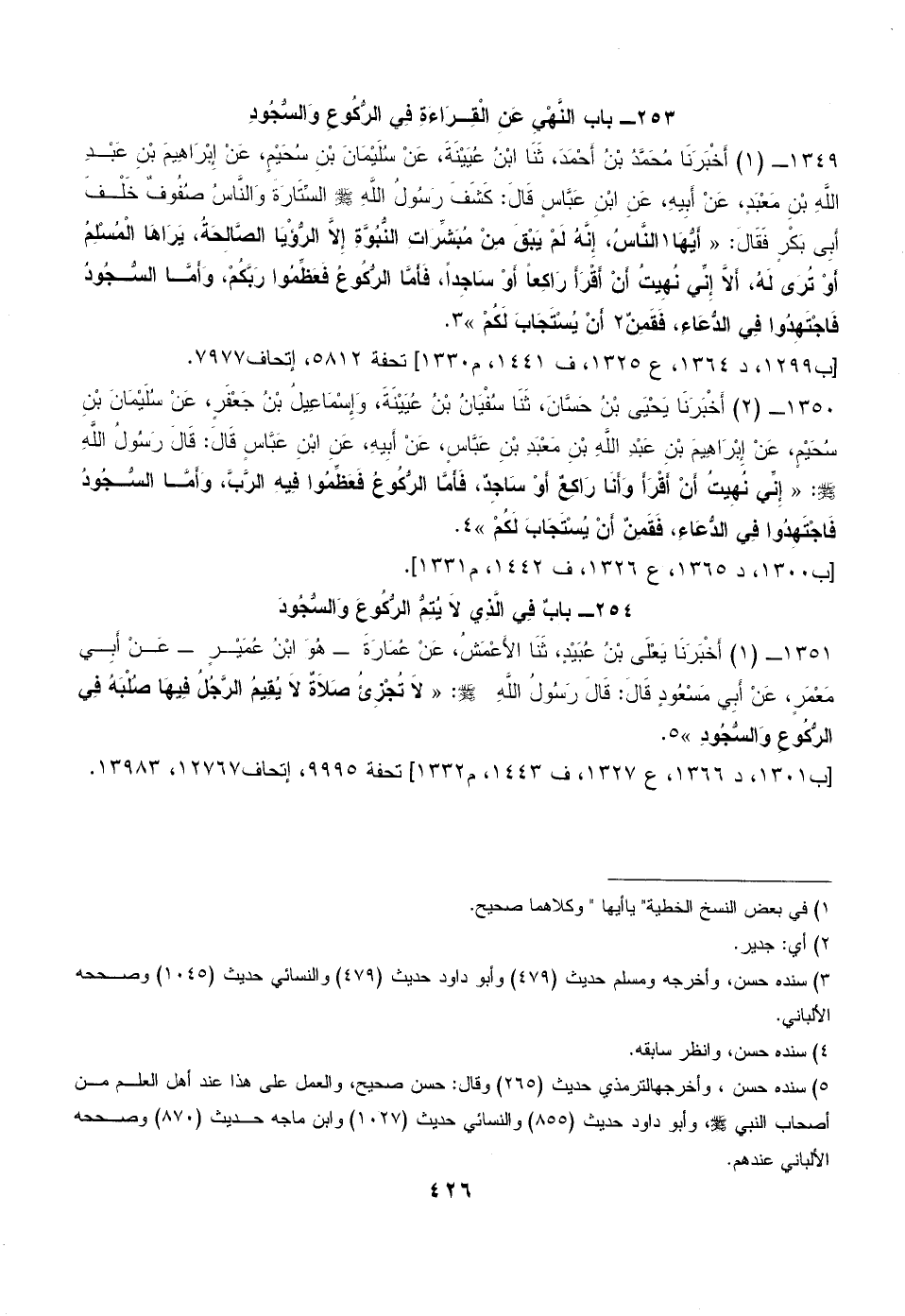 1351 - (1) أَخْبَرَنَا يَعْلَى بْنُ عُبَيْدٍ، ثَنَا الأَعْمَشُ، عَنْ عُمَارَةَ - هُوَ ابْنُ عُمَيْرٍ - عَنْ أَبِي مَعْمَرٍ، عَنْ أَبِي مَسْعُودٍ قَالَ: قَالَ رَسُولُ اللَّهِ - صلى الله عليه وسلم -: «لاَ تُجْزِئُ صَلاَةٌ لاَ يُقِيمُ الرَّجُلُ فِيهَا صُلْبَهُ فِي الرُّكُوعِ وَالسُّجُودِ» (¬5).
