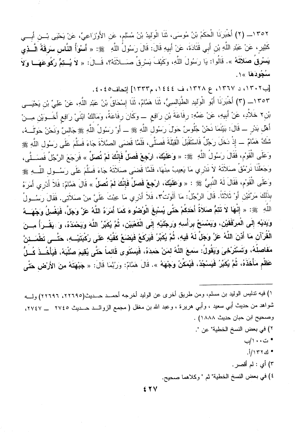 1353 - (3) أَخْبَرَنَا أَبُو الْوَلِيدِ الطَّيَالِسِيُّ، ثَنَا هَمَّامٌ، ثَنَا إِسْحَاقُ بْنُ عَبْدِ اللَّهِ، عَنْ عَلِيِّ بْنِ يَحْيَى بْنِ (¬2) خَلاَّدٍ، عَنْ أَبِيهِ، عَنْ عَمِّهِ: رِفَاعَةَ بْنِ رَافِعٍ - وَكَانَ رِفَاعَةُ، وَمَالِكُ ابْنَيْ رَافِعٍ أَخَوَيْنِ مِنْ أَهْلِ بَدْرٍ - قَالَ: بَيْنَمَا نَحْنُ جُلُوسٌ حَوْلَ رَسُولِ اللَّهِ - صلى الله عليه وسلم - - أَوْ رَسُولُ اللَّهِ - صلى الله عليه وسلم - جَالِسٌ وَنَحْنُ حَوْلَهُ، شَكَّ هَمَّامٌ - إِذْ دَخَلَ رَجُلٌ فَاسْتَقْبَلَ الْقِبْلَةَ فَصَلَّى، فَلَمَّا قَضَى الصَّلاَةَ جَاءَ فَسَلَّمَ عَلَى رَسُولِ اللَّهِ - صلى الله عليه وسلم - وَعَلَى الْقَوْمِ، فَقَالَ رَسُولُ اللَّهِ - صلى الله عليه وسلم -: «وَعَلَيْكَ، ارْجِعْ فَصَلِّ فَإِنَّكَ لَمْ تُصَلِّ» فَرَجَعَ الرَّجُلُ فَصَلَّى، وَجَعَلْنَا نَرْمُقُ صَلاَتَهُ لاَ نَدْرِي مَا يَعِيبُ مِنْهَا، فَلَمَّا قَضَى صَلاَتَهُ جَاءَ فَسَلَّمَ عَلَى رَسُولِ اللَّهِ - صلى الله عليه وسلم - وَعَلَى الْقَوْمِ، فَقَالَ لَهُ النَّبِيُّ - صلى الله عليه وسلم -: «وَعَلَيْكَ، ارْجِعْ فَصَلِّ فَإِنَّكَ لَمْ تُصَلِّ» قَالَ هَمَّامٌ: فَلاَ أَدْرِي أَمَرَهُ بِذَلِكَ مَرَّتَيْنِ أَوْ ثَلاَثاً. قَالَ الرَّجُلُ: مَا آَلَوْتُ (¬3)، فَلاَ أَدْرِي مَا عِبْتَ عَلَيَّ مِنْ صَلاَتِى. فَقَالَ رَسُولُ اللَّهِ - صلى الله عليه وسلم -: «إِنَّهَا لاَ تَتِمُّ صَلاَةُ أَحَدِكُمْ حَتَّى يُسْبِغَ الْوُضُوءَ كَمَا أَمَرَهُ اللَّهُ عَزَّ وَجَلَّ، فَيَغْسِلُ وَجْهَهُ وَيَدَيْهِ إِلَى الْمِرْفَقَيْنِ، وَيَمْسَحُ بِرَأْسِهِ وَرِجْلَيْهِ إِلَى الْكَعْبَيْنِ، ثُمَّ يُكَبِّرُ اللَّهَ وَيَحْمَدُهُ، وَ (¬4) يَقْرَأُ مِنَ الْقُرْآنِ مَا أَذِنَ اللَّهُ عَزَّ وَجَلَّ لَهُ فِيهِ، ثُمَّ يُكَبِّرُ فَيَرْكَعُ فَيَضَعُ كَفَّيْهِ عَلَى رُكْبَتَيْهِ، حَتَّى تَطْمَئِنَّ مَفَاصِلُهُ، وَتَسْتَرْخِىَ وَيَقُولُ: سَمِعَ اللَّهُ لِمَنْ حَمِدَهُ، فَيَسْتَوِى قَائِماً حَتَّى يُقِيمَ صُلْبَهُ، فَيَأْخُذَ كُلُّ عَظْمٍ مَأْخَذَهُ، ثُمَّ يُكَبِّرُ فَيَسْجُدُ، فَيُمَكِّنُ وَجْهَهُ». قَالَ هَمَّامٌ: وَرُبَّمَا قَالَ: «جَبْهَتَهُ مِنَ الأَرْضِ حَتَّى