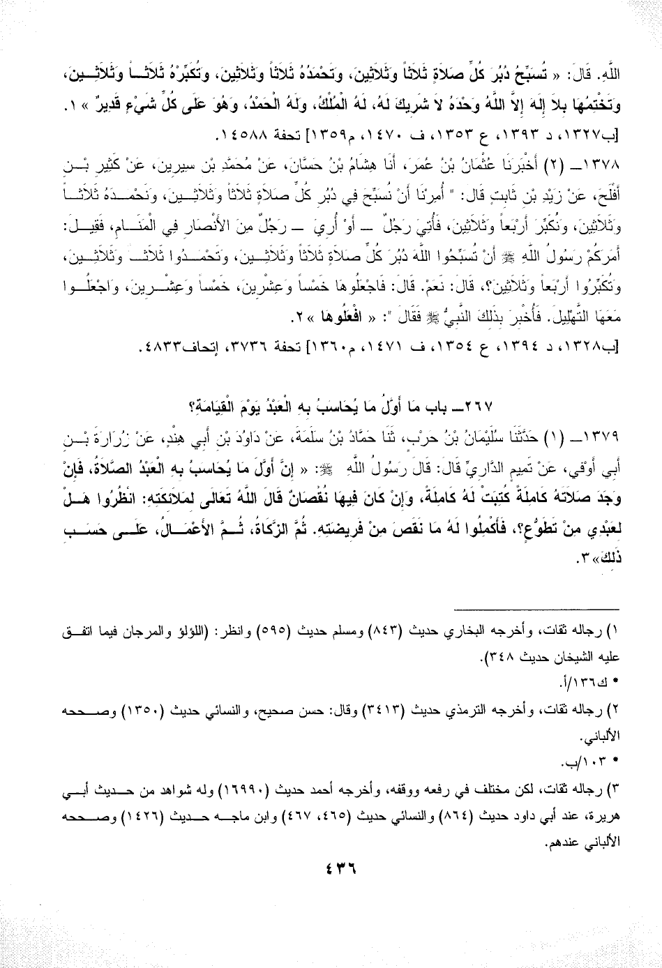 1379 - (1) حَدَّثَنَا سُلَيْمَانُ بْنُ حَرْبٍ، ثَنَا حَمَّادُ بْنُ سَلَمَةَ، عَنْ دَاوُدَ بْنِ أَبِي هِنْدٍ، عَنْ زُرَارَةَ بْنِ أَبِي أَوْفي، عَنْ تَمِيمٍ الدَّارِيِّ قَالَ: قَالَ رَسُولُ اللَّهِ - صلى الله عليه وسلم -: «إِنَّ أَوَّلَ مَا يُحَاسَبُ بِهِ الْعَبْدُ الصَّلاَةُ، فَإِنْ وَجَدَ صَلاَتَهُ كَامِلَةً كُتِبَتْ لَهُ كَامِلَةً، وَإِنْ كَانَ فِيهَا نُقْصَانٌ قَالَ اللَّهُ تَعَالَى لِمَلاَئِكَتِهِ: انْظُرُوا هَلْ لِعَبْدِي مِنْ تَطَوُّعٍ؟ ، فَأَكْمِلُوا لَهُ مَا نَقَصَ مِنْ فَرِيضَتِهِ. ثُمَّ الزَّكَاةُ، ثُمَّ الأَعْمَالُ، عَلَى حَسَبِ ذَلِكَ» (¬3).