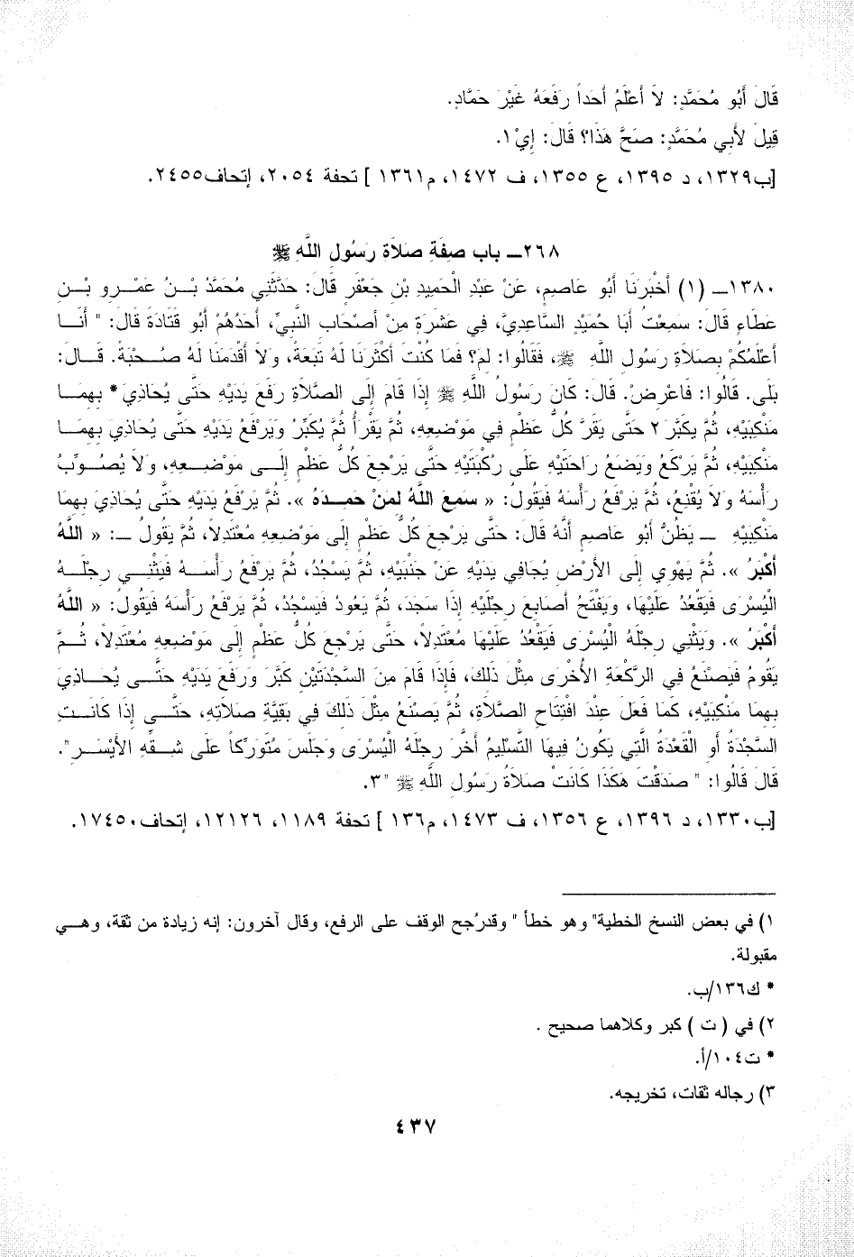 1380 - (1) أَخْبَرَنَا أَبُو عَاصِمٍ، عَنْ عَبْدِ الْحَمِيدِ بْنِ جَعْفَرٍ قَالَ: حَدَّثَنِي مُحَمَّدُ بْنُ عَمْرِو بْنِ عَطَاءٍ قَالَ: سَمِعْتُ أَبَا حُمَيْدٍ السَّاعِدِيَّ، فِي عَشَرَةٍ مِنْ أَصْحَابِ النَّبِيِّ، أَحَدُهُمْ أَبُو قَتَادَةَ قَالَ: " أَنَا أَعْلَمُكُمْ بِصَلاَةِ رَسُولِ اللَّهِ - صلى الله عليه وسلم -، فَقَالُوا: لِمَ؟ فَمَا كُنْتَ أَكْثَرَنَا لَهُ تَبَعَةً، وَلاَ أَقْدَمَنَا لَهُ صُحْبَةً. قَالَ: بَلَى. قَالُوا: فَاعْرِضْ. قَالَ: كَانَ رَسُولُ اللَّهِ - صلى الله عليه وسلم - إِذَا قَامَ إِلَى الصَّلاَةِ رَفَعَ يَدَيْهِ حَتَّى يُحَاذِيَ* بِهِمَا مَنْكِبَيْهِ، ثُمَّ يكَبَّرَ (¬2) حَتَّى يَقَرَّ كُلُّ عَظْمٍ فِي مَوْضِعِهِ، ثُمَّ يَقْرَأُ ثُمَّ يُكَبِّرُ وَيَرْفَعُ يَدَيْهِ حَتَّى يُحَاذِيَ بِهِمَا مَنْكِبَيْهِ، ثُمَّ يَرْكَعُ وَيَضَعُ رَاحَتَيْهِ عَلَى رُكْبَتَيْهِ حَتَّى يَرْجِعَ كُلُّ عَظْمٍ إِلَى مَوْضِعِهِ، وَلاَ يُصُوِّبُ رَأْسَهُ وَلاَ يُقْنِعُ، ثُمَّ يَرْفَعُ رَأْسَهُ فَيَقُولُ: «سَمِعَ اللَّهُ لِمَنْ حَمِدَهُ». ثُمَّ يَرْفَعُ يَدَيْهِ حَتَّى يُحَاذِيَ بِهِمَا مَنْكِبَيْهِ - يَظُنُّ أَبُو عَاصِمٍ أَنَّهُ قَالَ: حَتَّى يَرْجِعَ كُلُّ عَظْمٍ إِلَى مَوْضِعِهِ مُعْتَدِلاً، ثُمَّ يَقُولُ ـ: «اللَّهُ أَكْبَرُ». ثُمَّ يَهْوِي إِلَى الأَرْضِ يُجَافِي يَدَيْهِ عَنْ جَنْبَيْهِ، ثُمَّ يَسْجُدُ، ثُمَّ يَرْفَعُ رَأْسَهُ فَيَثْنِي رِجْلَهُ الْيُسْرَى فَيَقْعُدُ عَلَيْهَا، وَيَفْتَحُ أَصَابِعَ رِجْلَيْهِ إِذَا سَجَدَ، ثُمَّ يَعُودُ فَيَسْجُدُ، ثُمَّ يَرْفَعُ رَأْسَهُ فَيَقُولُ: «اللَّهُ أَكْبَرُ».