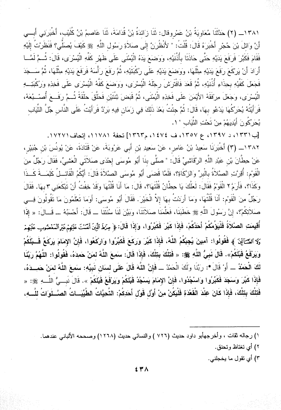 1381 - (2) حَدَّثَنَا مُعَاوِيَةُ بْنُ عَمْرٍو قال: ثَنَا زَائِدَةُ بْنُ قُدَامَةَ، ثَنَا عَاصِمُ بْنُ كُلَيْبٍ، أَخْبَرَنِي أَبِي أَنَّ وَائِلَ بْنَ حُجْرٍ أَخْبَرَهُ قَالَ: قُلْتُ: " لأَنْظُرَنَّ إِلَى صَلاَةِ رَسُولِ اللَّهِ - صلى الله عليه وسلم - كَيْفَ يُصَلِّي؟ فَنَظَرْتُ إِلَيْهِ فَقَامَ فَكَبَّرَ فَرَفَعَ يَدَيْهِ حَتَّى حَاذَتَا بِأُذُنَيْهِ، وَوَضَعَ يَدَهُ الْيُمْنَى عَلَى ظَهْرِ كَفِّهِ الْيُسْرَى، قَالَ: ثُمَّ لَمَّا أَرَادَ أَنْ يَرْكَعَ رَفَعَ يَدَيْهِ مِثْلَهَا، وَوَضَعَ يَدَيْهِ عَلَى رُكْبَتَيْهِ، ثُمَّ رَفَعَ رَأْسَهُ فَرَفَعَ يَدَيْهِ مِثْلَهَا، ثُمَّ سَجَدَ فَجَعَلَ كَفَّيْهِ بِحِذَاءِ أُذُنَيْهِ، ثُمَّ قَعَدَ فَافْتَرَشَ رِجْلَهُ الْيُسْرَى، وَوَضَعَ كَفَّهُ الْيُسْرَى عَلَى فَخِذِهِ وَرُكْبَتِهِ الْيُسْرَى، وَجَعَلَ مِرْفَقَهُ الأَيْمَنَ عَلَى فَخِذِهِ الْيُمْنَى، ثُمَّ قَبَضَ ثِنْتَيْنِ فَحَلَّقَ حَلْقَةً ثُمَّ رَفَعَ أُصْبُعَهُ، فَرَأَيْتُهُ يُحَرِّكُهَا يَدْعُو بِهَا، قَالَ: ثُمَّ جِئْتُ بَعْدَ ذَلِكَ فِي زَمَانٍ فِيهِ بَرْدٌ فَرَأَيْتُ عَلَى النَّاسِ جُلَّ الثِّيَابِ يُحَرِّكُونَ أَيْدِيَهُمْ مِنْ تَحْتِ الثِّيَابِ " (¬1).