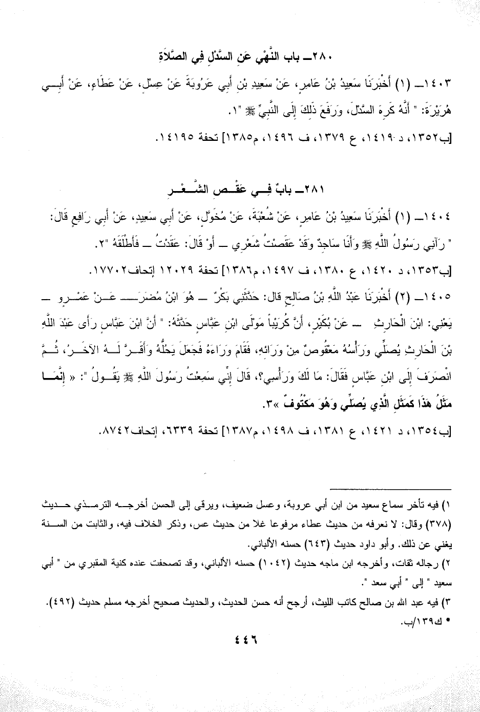 1405 - (2) أَخْبَرَنَا عَبْدُ اللَّهِ بْنُ صَالِحٍ قال: حَدَّثَنِي بَكْرٌ - هُوَ ابْنُ مُضَرَ - عَنْ عَمْرٍو - يَعْنِي: ابْنَ الْحَارِثِ - عَنْ بُكَيْرٍ، أَنَّ كُرَيْباً مَوْلَى ابْنِ عَبَّاسٍ حَدَّثَهُ: " أَنَّ ابْنَ عَبَّاسٍ رَأَى عَبْدَ اللَّهِ بْنَ الْحَارِثِ يُصَلِّي وَرَأْسُهُ مَعْقُوصٌ مِنْ وَرَائِهِ، فَقَامَ وَرَاءَهُ فَجَعَلَ يَحُلُّهُ وَأَقَرَّ لَهُ الآخَرُ، ثُمَّ انْصَرَفَ إِلَى ابْنِ عَبَّاسٍ فَقَالَ: مَا لَكَ وَرَأْسِي؟ ، قَالَ إِنِّي سَمِعْتُ رَسُولَ اللَّهِ - صلى الله عليه وسلم - يَقُولُ ": «إِنَّمَا مَثَلُ هَذَا كَمَثَلِ الَّذِي يُصَلِّي وَهُوَ مَكْتُوفٌ» (¬3).