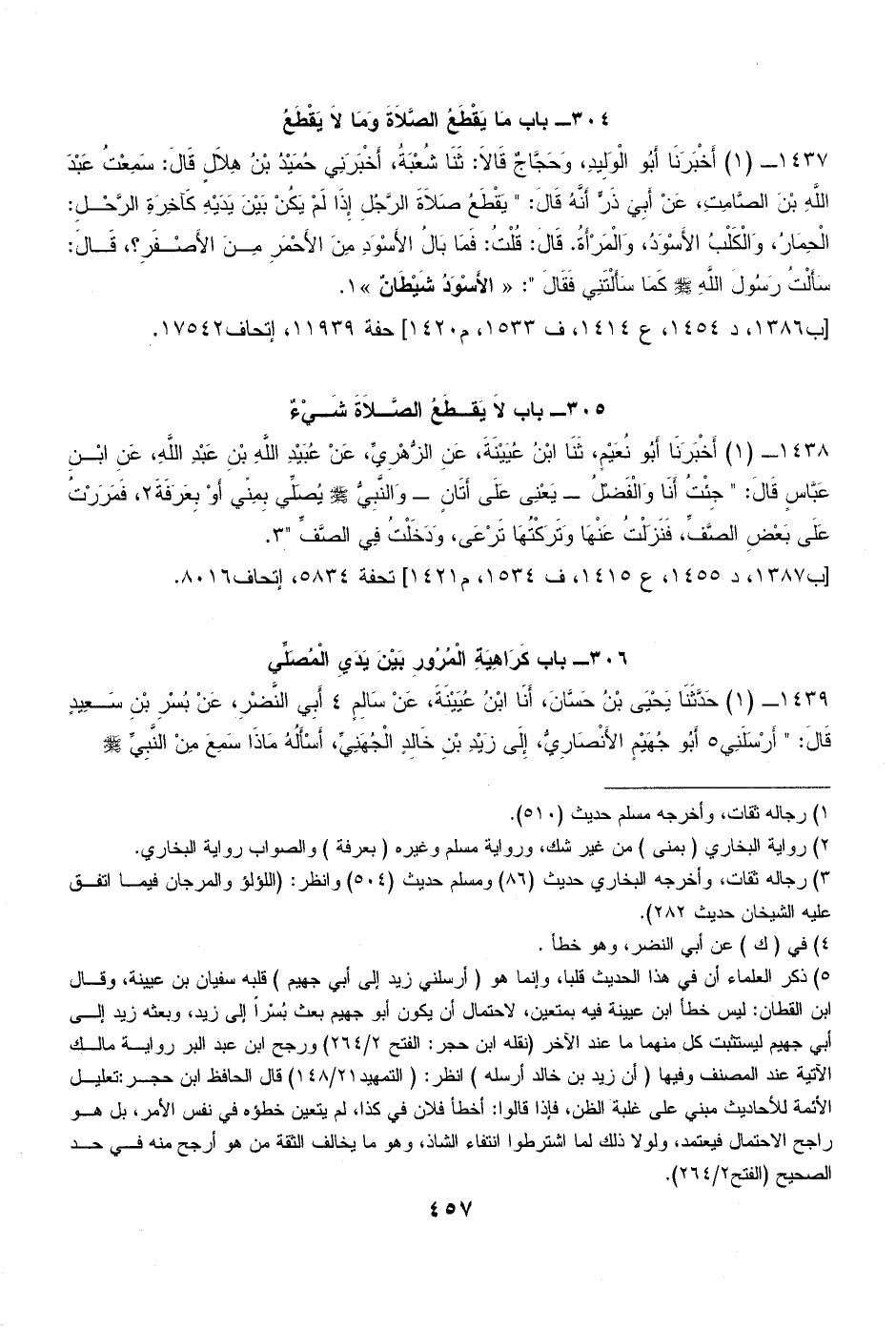 (¬5) ذكر العلماء أن في هذا الحديث قلبا، وإنما هو (أرسلني زيد إلى أبي جهيم) قلبه سفيان بن عيينة، وقال ابن القطان: ليس خطأ ابن عيينة فيه بمتعين، لاحتمال أن يكون أبو جهيم بعث بُسْراً إلى زيد، وبعثه زيد إلى أبي جهيم ليستثبت كل منهما ما عند الآخر (نقله ابن حجر: الفتح 2/ 264) ورجح ابن عبد البر رواية مالك الآتية عند المصنف وفيها (أن زيد بن خالد أرسله) انظر: (التمهيد 21/ 148) قال الحافظ ابن حجر: تعليل الأئمة للأحاديث مبني على غلبة الظن، فإذا قالوا: أخطأ فلان في كذا، لم يتعين خطؤه في نفس الأمر، بل هو راجح الاحتمال فيعتمد، ولولا ذلك لما اشترطوا انتفاء الشاذ، وهو ما يخالف الثقة من هو أرجح منه في حد الصحيح (الفتح 2/ 264).