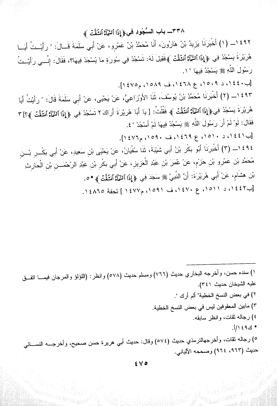 1492 - (1) أَخْبَرَنَا يَزِيدُ بْنُ هَارُونَ، أَنَا مُحَمَّدُ بْنُ عَمْرٍو، عَنْ أَبِي سَلَمَةَ قَالَ: " رَأَيْتُ أَبَا هُرَيْرَةَ يَسْجُدُ فِي {إِذَا السَّمَاءُ انْشَقَّتْ} فَقِيلَ لَهُ: تَسْجُدُ فِي سُورَةٍ مَا يُسْجَدُ فِيهَا؟ ، فَقَالَ: إِنِّي رَأَيْتُ رَسُولَ اللَّهِ - صلى الله عليه وسلم - يَسْجُدُ فِيهَا " (¬1).