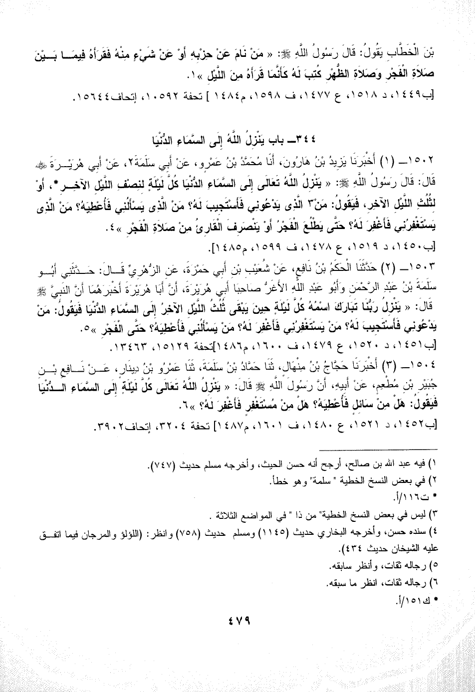 1502 - (1) أَخْبَرَنَا يَزِيدُ بْنُ هَارُونَ، أَنَا مُحَمَّدُ بْنُ عَمْرٍو، عَنْ أَبِي سَلَمَةَ (¬2)، عَنْ أَبِي هُرَيْرَةَ - رضي الله عنه - قَالَ: قَالَ رَسُولُ اللَّهِ - صلى الله عليه وسلم -: «يَنْزِلُ اللَّهُ تَعَالَى إِلَى السَّمَاءِ الدُّنْيَا كُلَّ لَيْلَةٍ لِنِصْفِ اللَّيْلِ الآخِرِ*، أَوْ لِثُلُثِ اللَّيْلِ الآخِرِ، فَيَقُولُ: مَنْ (¬3) الَّذِى يَدْعُونِي فَأَسْتَجِيبَ لَهُ؟ مَنْ الَّذِى يَسْأَلُنِي فَأُعْطِيَهُ؟ مَنْ الَّذِى يَسْتَغْفِرُنِي فَأَغْفِرَ لَهُ؟ حَتَّى يَطْلُعَ الْفَجْرُ أَوْ يَنْصَرِفَ الْقَارِئُ مِنْ صَلاَةِ الْفَجْرِ» (¬4).