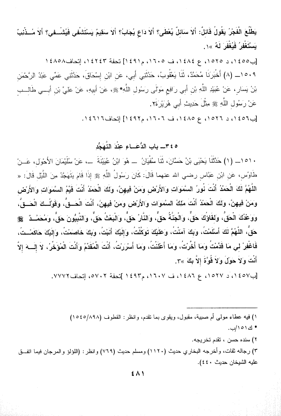 1510 - (1) حَدَّثَنَا يَحْيَى بْنُ حَسَّانَ، ثَنَا سُفْيَانُ - هُوَ ابْنُ عُيَيْنَةَ ـ، عَنْ سُلَيْمَانَ الأَحْوَلِ، عَنْ طَاوُسٍ، عَنِ ابْنِ عَبَّاسٍ رضي الله عنهما قَالَ: كَانَ رَسُولُ اللَّهِ - صلى الله عليه وسلم - إِذَا قَامَ يَتَهَجَّدُ مِنَ اللَّيْلِ قَالَ: «اللَّهُمَّ لَكَ الْحَمْدُ أَنْتَ نُورُ السَّمَوَاتِ وَالأَرْضِ وَمَنْ فِيهِنَّ، وَلَكَ الْحَمْدُ أَنْتَ قَيِّمُ السَّمَوَاتِ وَالأَرْضِ وَمَنْ فِيهِنَّ، وَلَكَ الْحَمْدُ أَنْتَ مَلِكُ السَّمَوَاتِ وَالأَرْضِ وَمَنْ فِيهِنَّ، أَنْتَ الْحَقُّ، وَقَوْلُكَ الْحَقُّ، وَوَعْدُكَ الْحَقُّ، وَلِقَاؤُكَ حَقٌّ، وَالْجَنَّةُ حَقٌّ، وَالنَّارُ حَقٌّ، وَالْبَعْثُ حَقٌّ، وَالنَّبِيُّونَ حَقٌّ، وَمُحَمَّدٌ - صلى الله عليه وسلم - حَقٌّ، اللَّهُمَّ لَكَ أَسْلَمْتُ، وَبِكَ آمَنْتُ، وَعَلَيْكَ تَوَكَّلْتُ، وَإِلَيْكَ أَنَبْتُ، وَبِكَ خَاصَمْتُ، وَإِلَيْكَ حَاكَمْتُ، فَاغْفِرْ لِي مَا قَدَّمْتُ وَمَا أَخَّرْتُ، وَمَا أَعْلَنْتُ، وَمَا أَسْرَرْتُ، أَنْتَ الْمُقَدِّمُ وَأَنْتَ الْمُؤَخِّرُ، لاَ إِلَهَ إِلاَّ أَنْتَ وَلاَ حَوْلَ وَلاَ قُوَّةَ إِلاَّ بِكَ» (¬3).