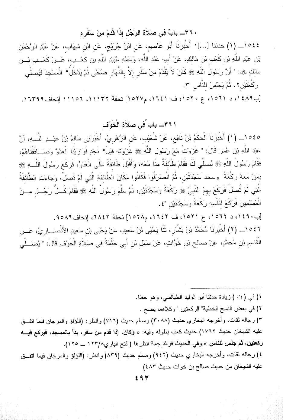(¬3) رجاله ثقات، وأخرجه البخاري حديث (3088) ومسلم حديث (716) وانظر: (اللؤلؤ والمرجان فيما اتفق عليه الشيخان حديث 1762) حديث كعب بطوله وفيه: «وكان، إذا قدم من سفر، بدأ بالمسجد، فيركع فيه ركعتين، ثم جلس للناس» وفي الحديث فوائد جمة انظرها (فتح الباري 8/ 123 - 125).