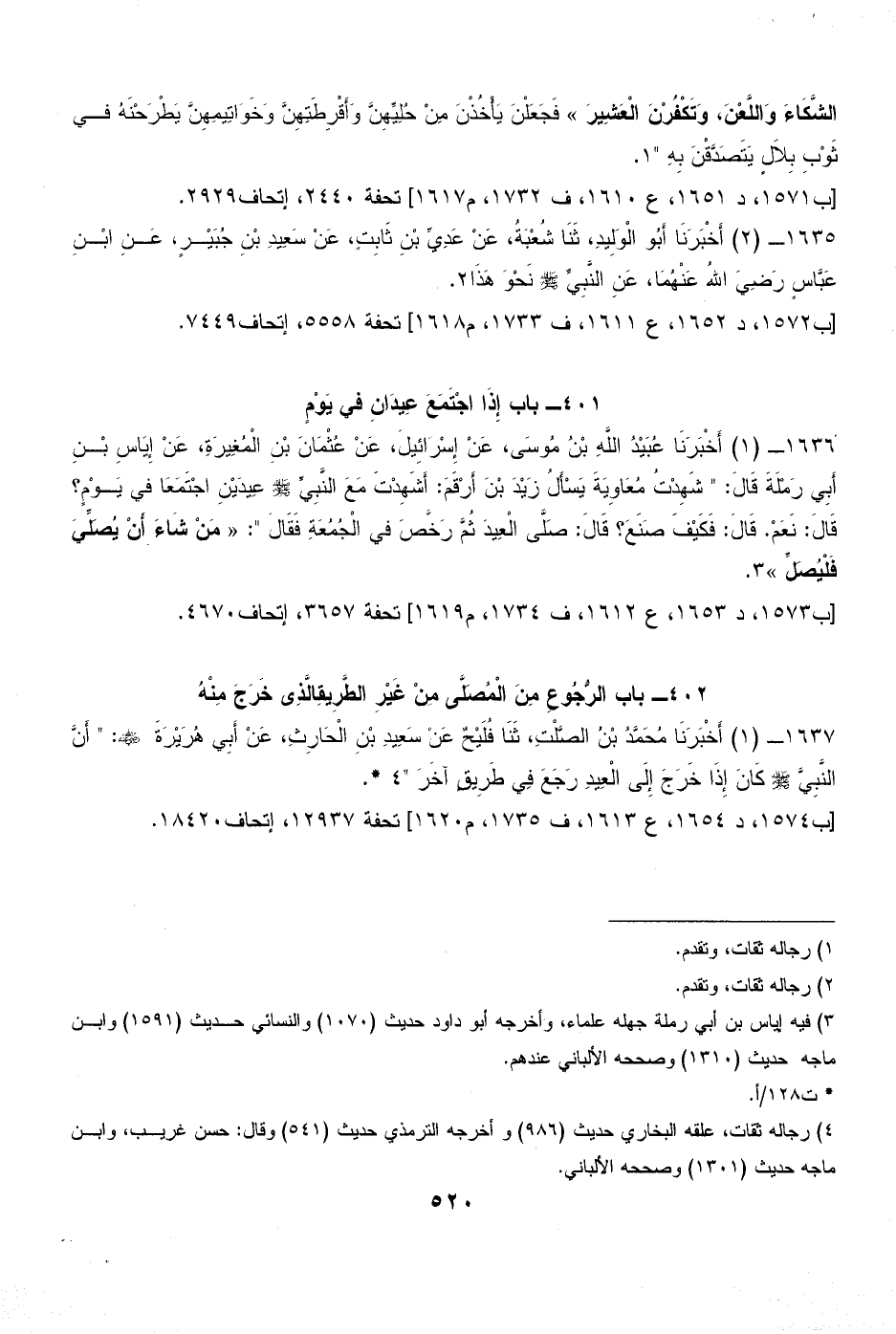 1637 - (1) أَخْبَرَنَا مُحَمَّدُ بْنُ الصَّلْتِ، ثَنَا فُلَيْحٌ عَنْ سَعِيدِ بْنِ الْحَارِثِ، عَنْ أَبِي هُرَيْرَةَ - رضي الله عنه -: " أَنَّ النَّبِيَّ - صلى الله عليه وسلم - كَانَ إِذَا خَرَجَ إِلَى الْعِيدِ رَجَعَ فِي طَرِيقٍ آخَرَ " (¬4) *.