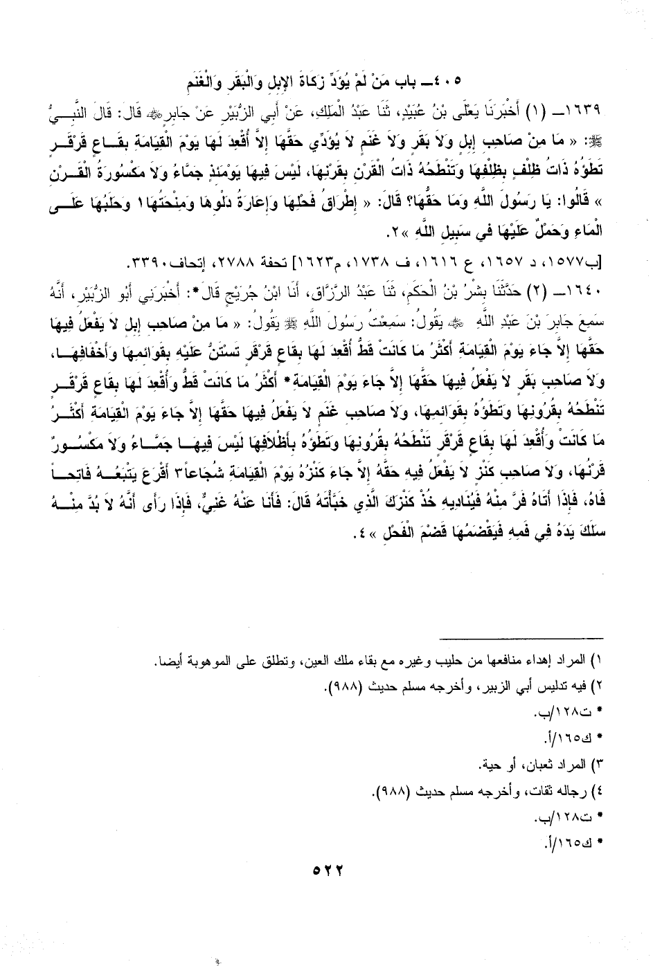1640 - (2) حَدَّثَنَا بِشْرُ بْنُ الْحَكَمِ، ثَنَا عَبْدُ الرَّزَّاقِ، أَنَا ابْنُ جُرَيْجٍ قَالَ*: أَخْبَرَنِي أَبُو الزُّبَيْرِ، أَنَّهُ سَمِعَ جَابِرَ بْنَ عَبْدِ اللَّهِ - رضي الله عنه - يَقُولُ: سَمِعْتُ رَسُولَ اللَّهِ - صلى الله عليه وسلم - يَقُولُ: «مَا مِنْ صَاحِبِ إِبِلٍ لاَ يَفْعَلُ فِيهَا حَقَّهَا إِلاَّ جَاءَ يَوْمَ الْقِيَامَةِ أَكْثَرُ مَا كَانَتْ قَطُّ أُقْعِدَ لَهَا بِقَاعٍ قَرْقَرٍ تَسْتَنُّ عَلَيْهِ بِقَوَائِمِهَا وَأَخْفَافِهَا، وَلاَ صَاحِبِ بَقَرٍ لاَ يَفْعَلُ فِيهَا حَقَّهَا إِلاَّ جَاءَ يَوْمَ الْقِيَامَةِ* أَكْثَرُ مَا كَانَتْ قَطُّ وَأُقْعِدَ لَهَا بِقَاعٍ قَرْقَرٍ تَنْطَحُهُ بِقُرُونِهَا وَتَطَؤُهُ بِقَوَائِمِهَا، وَلاَ صَاحِبِ غَنَمٍ لاَ يَفْعَلُ فِيهَا حَقَّهَا إِلاَّ جَاءَ يَوْمَ الْقِيَامَةِ أَكْثَرُ مَا كَانَتْ وَأُقْعِدَ لَهَا بِقَاعٍ قَرْقَرٍ تَنْطَحُهُ بِقُرُونِهَا وَتَطَؤُهُ بِأَظْلاَفِهَا لَيْسَ فِيهَا جَمَّاءُ وَلاَ مَكْسُورٌ قَرْنُهَا، وَلاَ صَاحِبِ كَنْزٍ لاَ يَفْعَلُ فِيهِ حَقَّهُ إِلاَّ جَاءَ كَنْزُهُ يَوْمَ الْقِيَامَةِ شُجَاعاً (¬3) أَقْرَعَ يَتْبَعُهُ فَاتِحاً فَاهُ، فَإِذَا أَتَاهُ فَرَّ مِنْهُ فَيُنَادِيهِ خُذْ كَنْزَكَ الَّذِي خَبَّأْتَهُ قَالَ: فَأَنَا عَنْهُ غَنِيٌّ، فَإِذَا رَأَى أَنَّهُ لاَ بُدَّ مِنْهُ سَلَكَ يَدَهُ فِي فَمِهِ فَيَقْضَمُهَا قَضْمَ الْفَحْلِ» (¬4).