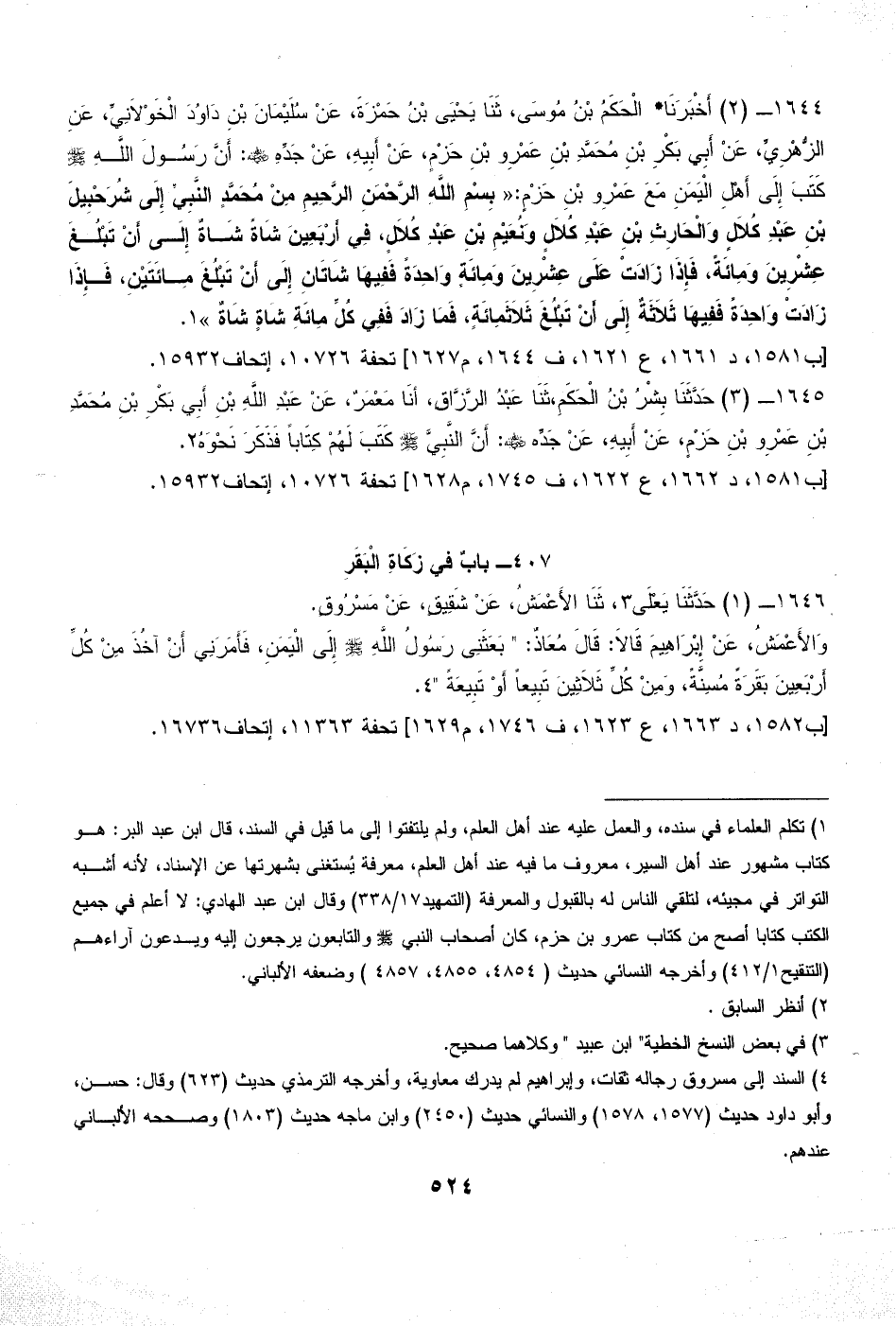 (¬1) تكلم العلماء في سنده، والعمل عليه عند أهل العلم، ولم يلتفتوا إلى ما قيل في السند، قال ابن عبد البر: هو كتاب مشهور عند أهل السير، معروف ما فيه عند أهل العلم، معرفة يُستغنى بشهرتها عن الإسناد، لأنه أشبه التواتر في مجيئه، لتلقي الناس له بالقبول والمعرفة (التمهيد 17/ 338) وقال ابن عبد الهادي: لا أعلم في جميع الكتب كتابا أصح من كتاب عمرو بن حزم، كان أصحاب النبي - صلى الله عليه وسلم - والتابعون يرجعون إليه ويدعون آراءهم (التنقيح 1/ 412) وأخرجه النسائي حديث (4854، 4855، 4857) وضعفه الألباني.