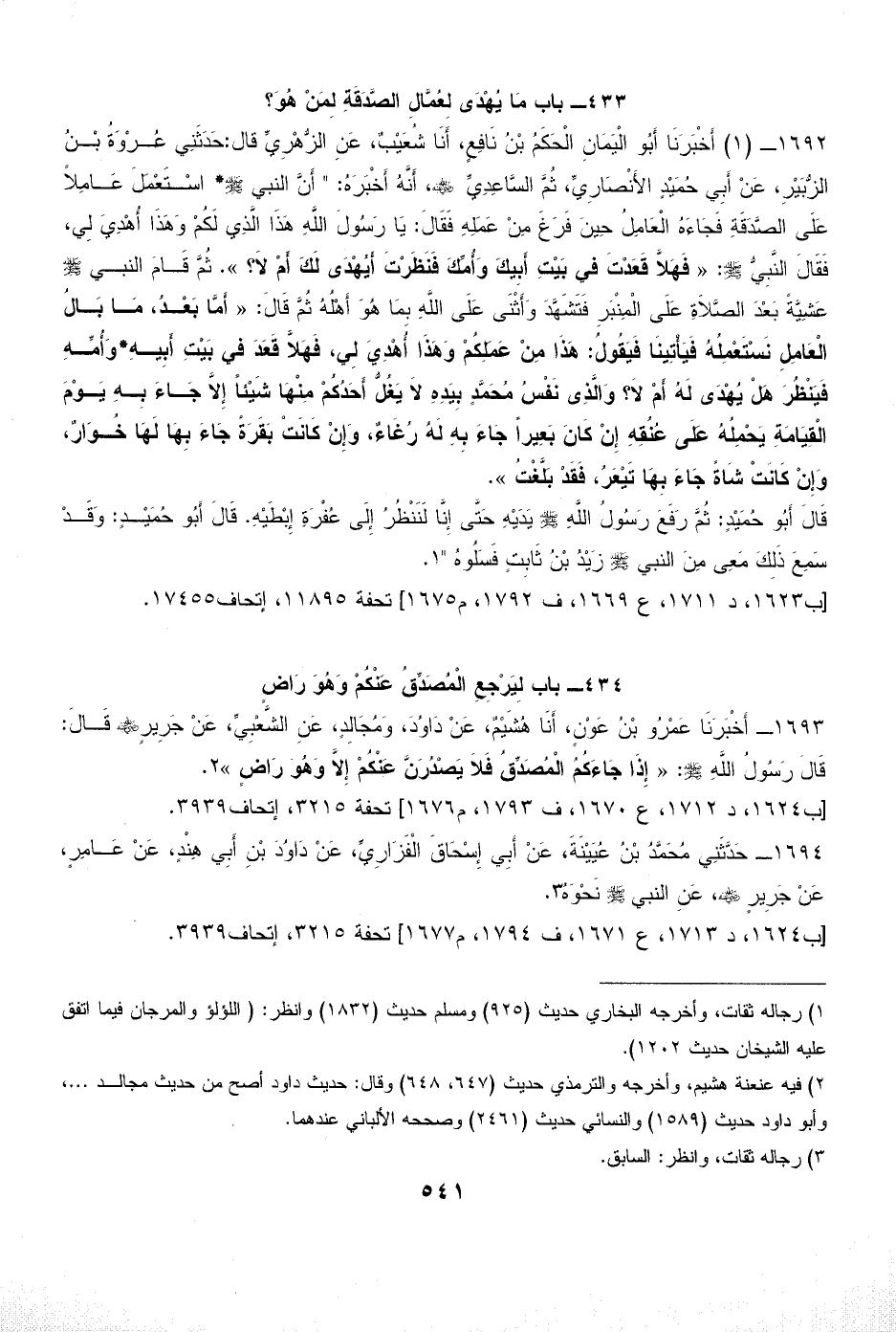 1692 - (1) أَخْبَرَنَا أَبُو الْيَمَانِ الْحَكَمُ بْنُ نَافِعٍ، أَنَا شُعَيْبٌ، عَنِ الزُّهْرِيِّ قال: حَدَثَنِي عُرْوَةُ بْنُ الزُّبَيْرِ، عَنْ أَبِي حُمَيْدٍ الأَنْصَارِيِّ، ثُمَّ السَّاعِدِيِّ - رضي الله عنه -، أَنَّهُ أَخْبَرَهُ: " أَنَّ النبي - صلى الله عليه وسلم - * اسْتَعْمَلَ عَامِلاً عَلَى الصَّدَقَةِ فَجَاءَهُ الْعَامِلُ حِينَ فَرَغَ مِنْ عَمَلِهِ فَقَالَ: يَا رَسُولَ اللَّهِ هَذَا الَّذِي لَكُمْ وَهَذَا أُهْدِيَ لِي، فَقَالَ النَّبِيُّ - صلى الله عليه وسلم -: «فَهَلاَّ قَعَدْتَ في بَيْتِ أَبِيكَ وَأُمِّكَ فَنَظَرْتَ أَيُهْدَى لَكَ أَمْ لاَ؟ ». ثُمَّ قَامَ النبي - صلى الله عليه وسلم - عَشِيَّةً بَعْدَ الصَّلاَةِ عَلَى الْمِنْبَرِ فَتَشَهَّدَ وَأَثْنَى عَلَى اللَّهِ بِمَا هُوَ أَهْلُهُ ثُمَّ قَالَ: «أَمَّا بَعْدُ، مَا بَالُ الْعَامِلِ نَسْتَعْمِلُهُ فَيَأْتِينَا فَيَقُولُ: هَذَا مِنْ عَمَلِكُمْ وَهَذَا أُهْدِيَ لِي، فَهَلاَّ قَعَدَ في بَيْتِ أَبِيهِ*وَأُمِّهِ فَيَنْظُرَ هَلْ يُهْدَى لَهُ أَمْ لاَ؟ وَالَّذِى نَفْسُ مُحَمَّدٍ بِيَدِهِ لاَ يَغُلُّ أَحَدُكُمْ مِنْهَا شَيْئاً إِلاَّ جَاءَ بِهِ يَوْمَ الْقِيَامَةِ يَحْمِلُهُ عَلَى عُنُقِهِ إِنْ كَانَ بَعِيراً جَاءَ بِهِ لَهُ رُغَاءٌ، وَإِنْ كَانَتْ بَقَرَةً جَاءَ بِهَا لَهَا خُوَارٌ، وَإِنْ كَانَتْ شَاةً جَاءَ بِهَا تَيْعَرُ، فَقَدْ بَلَّغْتُ».