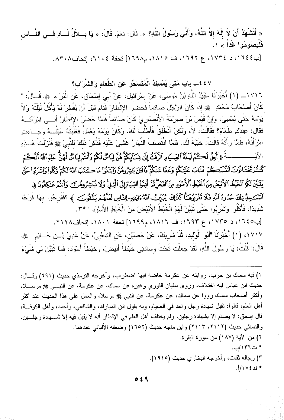 1717، (1) أَخْبَرَنَا*أَبُو الْوَلِيدِ، ثَنَا شَرِيكٌ، عَنْ حُصَيْنٍ، عَنِ الشَّعْبِيِّ، عَنْ عَدِيِّ بْنِ حَاتِمٍ - رضي الله عنه - قَالَ: " قُلْتُ: يَا رَسُولَ اللَّهِ، لَقَدْ جَعَلْتُ تَحْتَ وِسَادَتِي خَيْطاً أَبْيَضَ، وَخَيْطاً أَسْوَدَ، فَمَا تَبَيَّنَ لِي شَيْءٌ ".