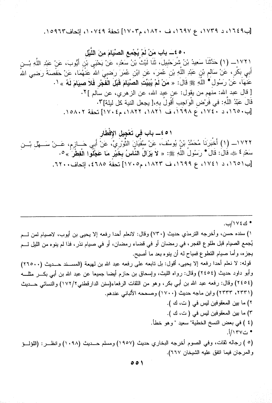 (¬1) سنده حسن، وأخرجه الترمذي حديث (730) وقال: لانعلم أحدا رفعه إلا يحيى بن أيوب، لاصيام لمن لم يُجمع الصيام قبل طلوع الفجر، في رمضان أو في قضاء رمضان، أو في صيام نذر، فذا لم ينوه من الليل لم يجزه، وأما صيام التطوع فمباح له أن ينوه بعد ما أصبح.