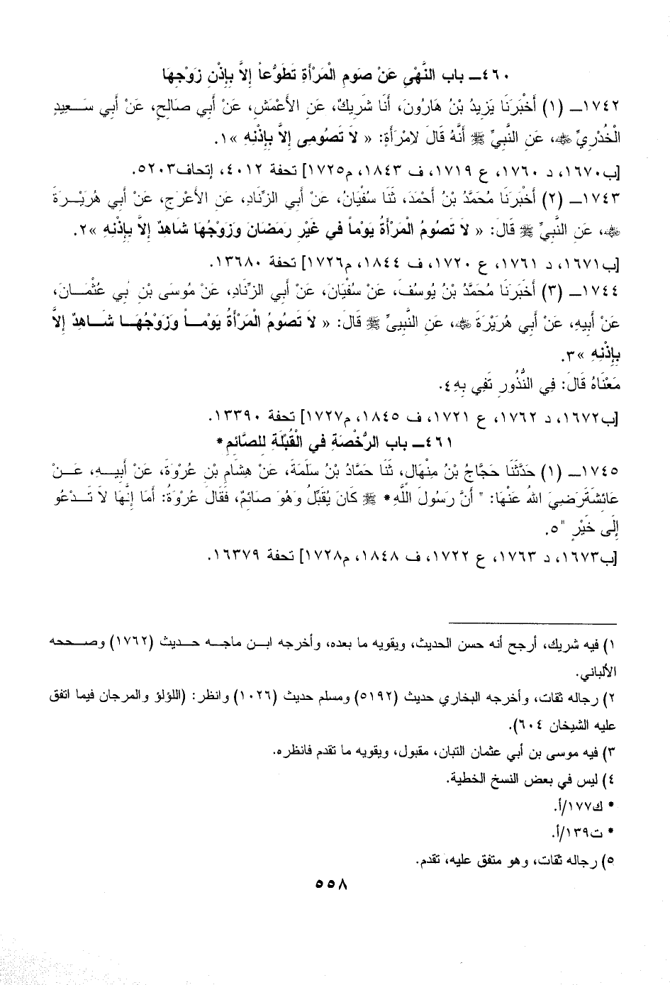 1742 - (1) أَخْبَرَنَا يَزِيدُ بْنُ هَارُونَ، أَنَا شَرِيكٌ، عَنِ الأَعْمَشِ، عَنْ أَبِي صَالِحٍ، عَنْ أَبِي سَعِيدٍ الْخُدْرِيِّ - رضي الله عنه -، عَنِ النَّبِيِّ - صلى الله عليه وسلم - أَنَّهُ قَالَ لاِمْرَأَةٍ: «لاَ تَصُومِى إِلاَّ بِإِذْنِهِ» (¬1).