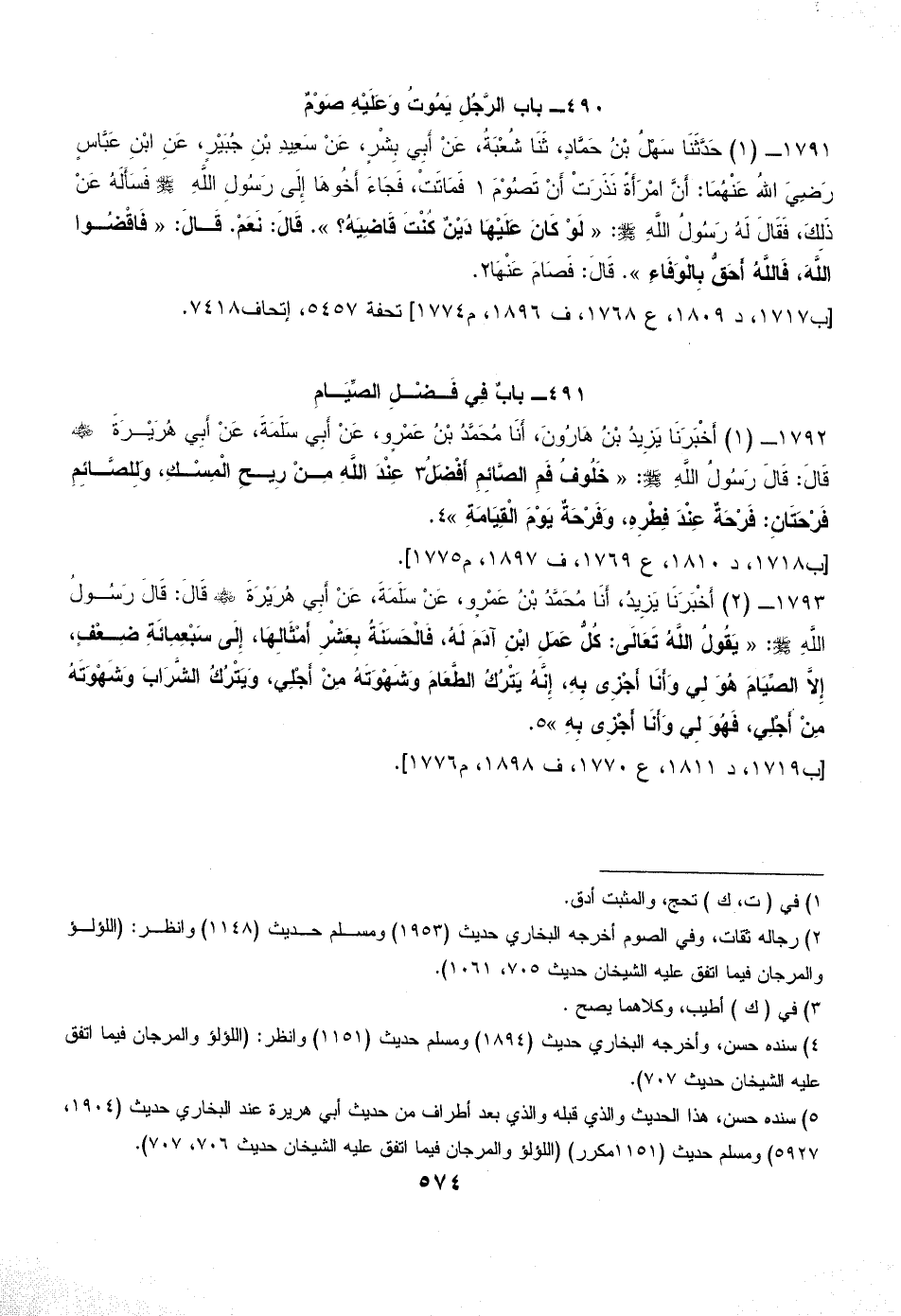 (¬5) سنده حسن، هذا الحديث والذي قبله والذي بعد أطراف من حديث أبي هريرة عند البخاري حديث (1904، 5927) ومسلم حديث (1151 مكرر) (اللؤلؤ والمرجان فيما اتفق عليه الشيخان حديث 706، 707).