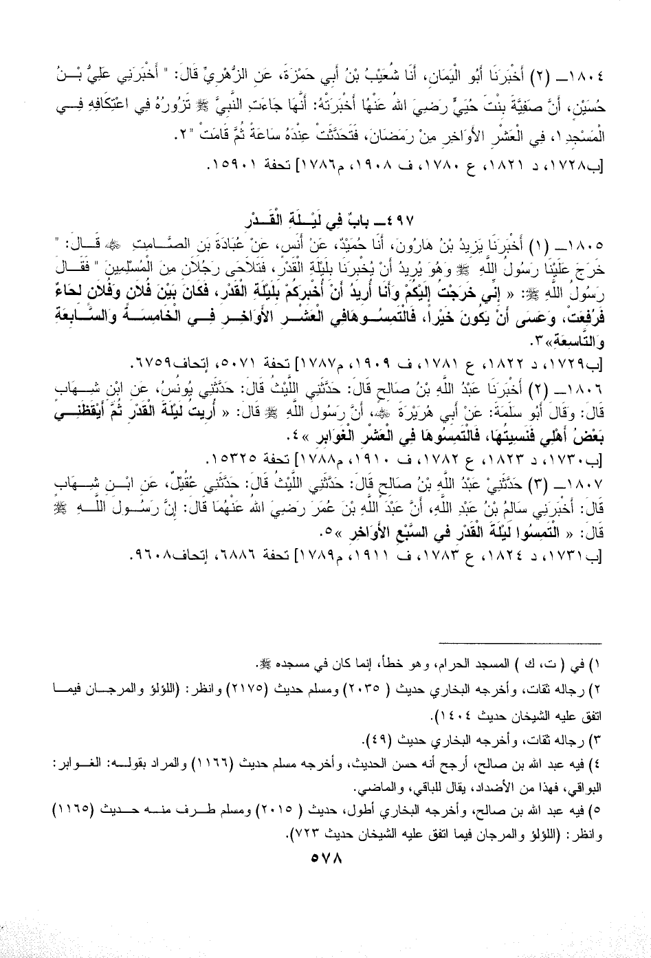 1805 - (1) أَخْبَرَنَا يَزِيدُ بْنُ هَارُونَ، أَنَا حُمَيْدٌ، عَنْ أَنَسٍ، عَنْ عُبَادَةَ بَنِ الصَّامِتِ - رضي الله عنه - قَالَ: " خَرَجَ عَلَيْنَا رَسُولُ اللَّهِ - صلى الله عليه وسلم - وَهُوَ يُرِيدُ أَنْ يُخْبِرَنَا بِلَيْلَةِ الْقَدْرِ، فَتَلاَحَى رَجُلاَنِ مِنَ الْمُسْلِمِينَ " فَقَالَ رَسُولُ اللَّهِ - صلى الله عليه وسلم -: «إِنِّي خَرَجْتُ إِلَيْكُمْ وَأَنَا أُرِيدُ أَنْ أُخْبِرَكُمْ بِلَيْلَةِ الْقَدْرِ، فَكَانَ بَيْنَ فُلاَنٍ وَفُلاَنٍ لِحَاءٌ فَرُفِعَتْ، وَعَسَى أَنْ يَكُونَ خَيْراً، فَالْتَمِسُوهَا فِي الْعَشْرِ الأَوَاخِرِ فِي الْخَامِسَةِ وَالسَّابِعَةِ وَالتَّاسِعَةِ» (¬3).