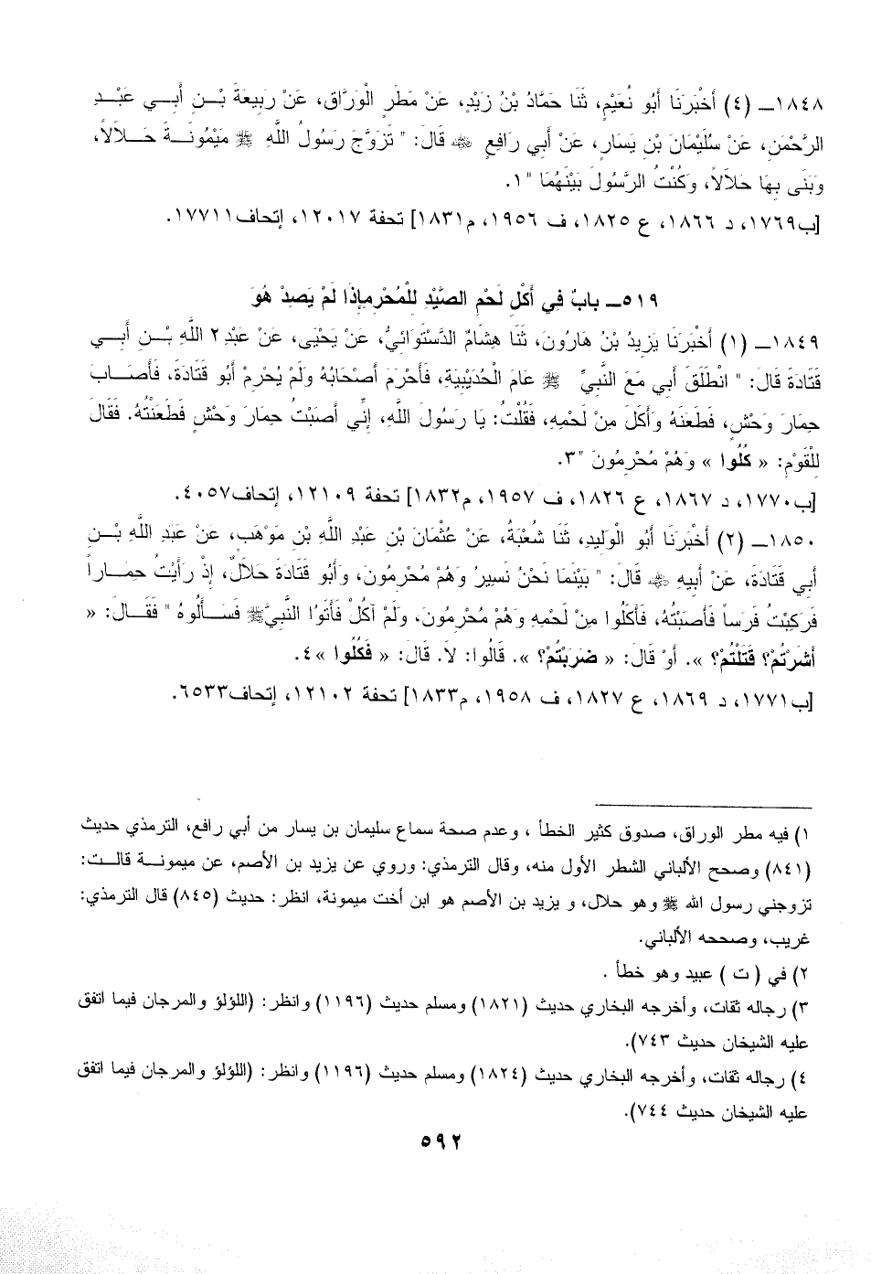 1850 - (2) أَخْبَرَنَا أَبُو الْوَلِيدِ، ثَنَا شُعْبَةُ، عَنْ عُثْمَانَ بْنِ عَبْدِ اللَّهِ بْنِ مَوْهَبٍ، عَنْ عَبْدِ اللَّهِ بْنِ أَبِي قَتَادَةَ، عَنْ أَبِيهِ - رضي الله عنه - قَالَ: " بَيْنَمَا نَحْنُ نَسِيرُ وَهُمْ مُحْرِمُونَ، وَأَبُو قَتَادَةَ حَلاَلٌ، إِذْ رَأَيْتُ حِمَاراً فَرَكِبْتُ فَرَساً فَأَصَبْتُهُ، فَأَكَلُوا مِنْ لَحْمِهِ وَهُمْ مُحْرِمُونَ، وَلَمْ آكُلْ فَأَتَوُا النَّبِيَّ - صلى الله عليه وسلم - فَسَأَلُوهُ " فَقَالَ: «أَشَرْتُمْ؟ قَتَلْتُمْ؟ ». أَوْ قَالَ: «ضَرَبْتُمْ؟ ». قَالُوا: لاَ. قَالَ: «فَكُلُوا» (¬4).