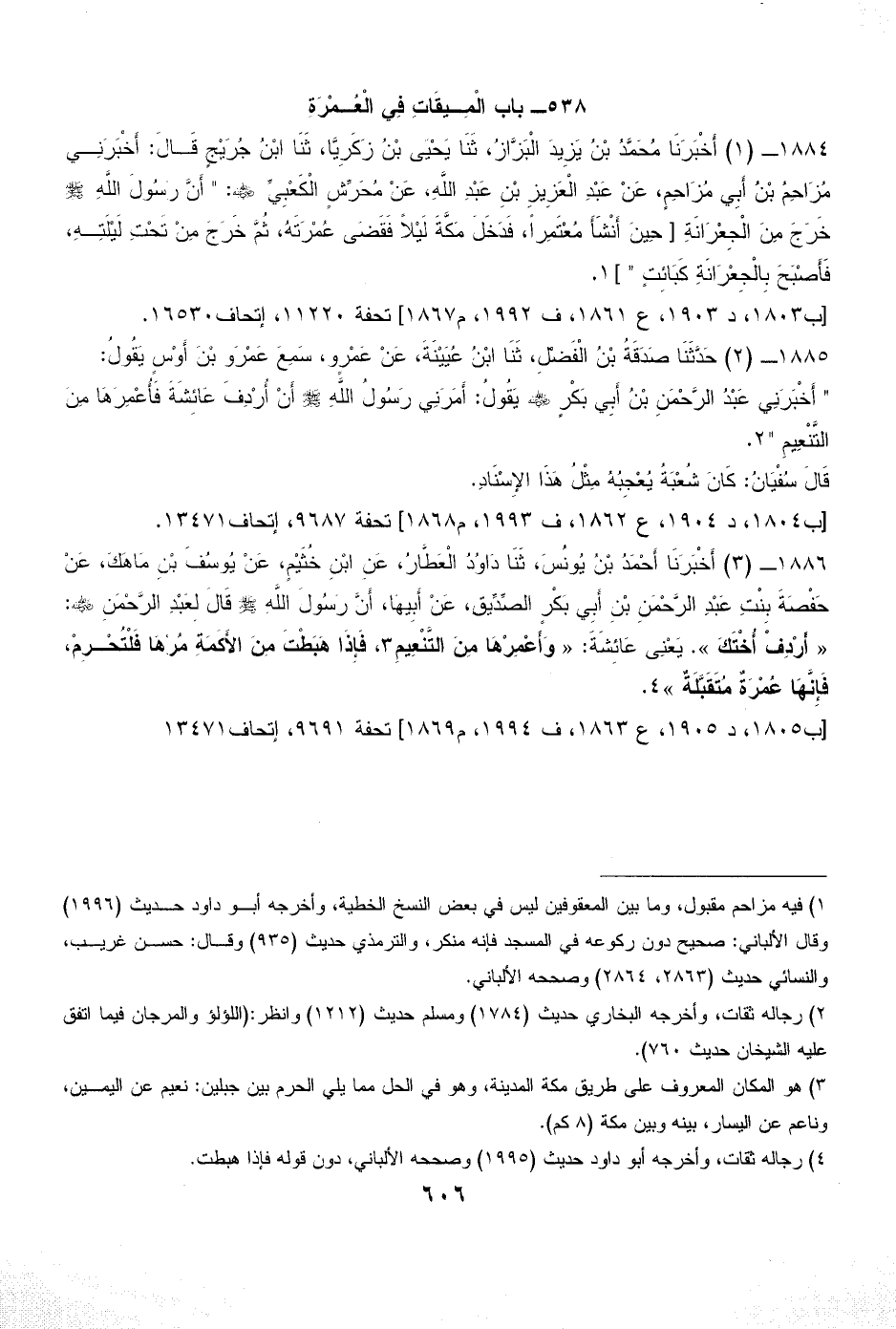 1884 - (1) أَخْبَرَنَا مُحَمَّدُ بْنُ يَزِيدَ الْبَزَّازُ، ثَنَا يَحْيَى بْنُ زَكَرِيَّا، ثَنَا ابْنُ جُرَيْجٍ قَالَ: أَخْبَرَنِي مُزَاحِمُ بْنُ أَبِي مُزَاحِمٍ، عَنْ عَبْدِ الْعَزِيزِ بْنِ عَبْدِ اللَّهِ، عَنْ مُحَرِّشٍ الْكَعْبِيِّ - رضي الله عنه -: " أَنَّ رَسُولَ اللَّهِ - صلى الله عليه وسلم - خَرَجَ مِنَ الْجِعْرَانَةِ [حِينَ أَنْشَأَ مُعْتَمِراً، فَدَخَلَ مَكَّةَ لَيْلاً فَقَضَى عُمْرَتَهُ، ثُمَّ خَرَجَ مِنْ تَحْتِ لَيْلَتِهِ، فَأَصْبَحَ بِالْجِعْرَانَةِ كَبَائِتٍ "] (¬1).