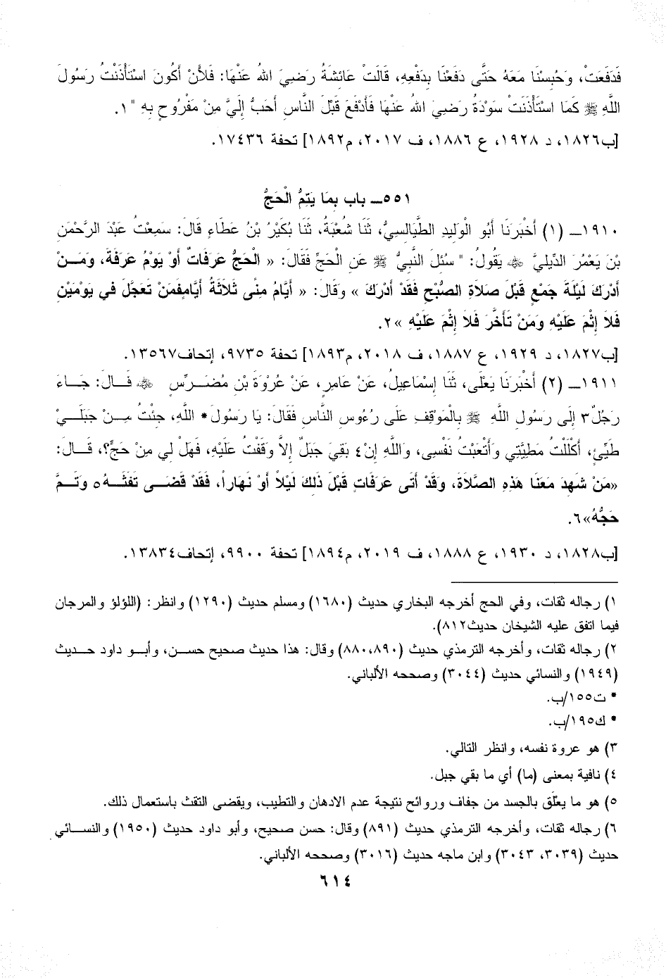 1910 - (1) أَخْبَرَنَا أَبُو الْوَلِيدِ الطَّيَالِسِيُّ، ثَنَا شُعْبَةُ، ثَنَا بُكَيْرُ بْنُ عَطَاءٍ قَالَ: سَمِعْتُ عَبْدَ الرَّحْمَنِ بْنَ يَعْمُرَ الدِّيليَّ - رضي الله عنه - يَقُولُ: " سُئِلَ النَّبِيُّ - صلى الله عليه وسلم - عَنِ الْحَجِّ فَقَالَ: «الْحَجُّ عَرَفَاتٌ أَوْ يَوْمُ عَرَفَةَ، وَمَنْ أَدْرَكَ لَيْلَةَ جَمْعٍ قَبْلَ صَلاَةِ الصُّبْحِ فَقَدْ أَدْرَكَ» وَقَالَ: «أَيَّامُ مِنًى ثَلاَثَةُ أَيَّامٍ فَمَنْ تَعَجَّلَ في يَوْمَيْنِ فَلاَ إِثْمَ عَلَيْهِ وَمَنْ تَأَخَّرَ فَلاَ إِثْمَ عَلَيْهِ» (¬2).