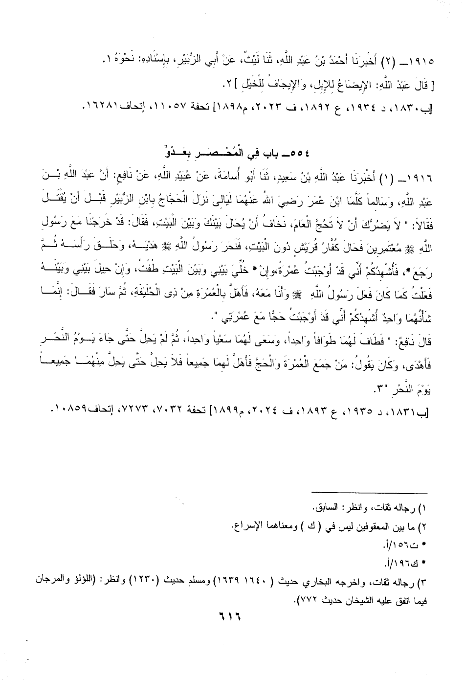 1916 - (1) أَخْبَرَنَا عَبْدُ اللَّهِ بْنُ سَعِيدٍ، ثَنَا أَبُو أُسَامَةَ، عَنْ عُبَيْدِ اللَّهِ، عَنْ نَافِعٍ: أَنَّ عَبْدَ اللَّهِ بْنَ عَبْدِ اللَّهِ، وَسَالِماً كَلَّمَا ابْنَ عُمَرَ رَضِيَ اللهُ عَنْهُمَا لَيَالِىَ نَزَلَ الْحَجَّاجُ بِابْنِ الزُّبَيْرِ قَبْلَ أَنْ يُقْتَلَ فَقَالاَ: " لاَ يَضُرُّكَ أَنْ لاَ تَحُجَّ الْعَامَ، نَخَافُ أَنْ يُحَالَ بَيْنَكَ وَبَيْنَ الْبَيْتِ، فَقَالَ: قَدْ خَرَجْنَا مَعَ رَسُولِ اللَّهِ - صلى الله عليه وسلم - مُعْتَمِرِينَ فَحَالَ كُفَّارُ قُرَيْشٍ دُونَ الْبَيْتِ، فَنَحَرَ رَسُولُ اللَّهِ - صلى الله عليه وسلم - هَدْيَهُ، وَحَلَقَ رَأْسَهُ ثُمَّ رَجَعَ*، فَأُشْهِدُكُمْ أَنِّي قَدْ أَوْجَبْتُ عُمْرَةً، وإِنْ* خُلِّيَ بَيْنِي وَبَيْنَ الْبَيْتِ طُفْتُ، وَإِنْ حِيلَ بَيْنِي وَبَيْنَهُ فَعَلْتُ كَمَا كَانَ فَعَلَ رَسُولُ اللَّهِ - صلى الله عليه وسلم - وَأَنَا مَعَهُ، فَأَهَلَّ بِالْعُمْرَةِ مِنْ ذِى الْحُلَيْفَةِ، ثُمَّ سَارَ فَقَالَ: إِنَّمَا شَأْنُهُمَا وَاحِدٌ أُشْهِدُكُمْ أَنِّي قَدْ أَوْجَبْتُ حَجًّا مَعَ عُمْرَتِي ".