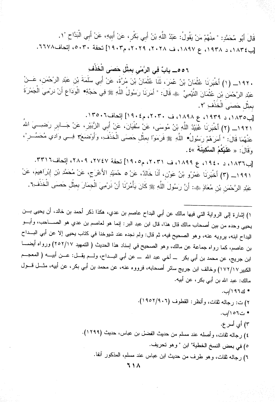 1920 - (1) أَخْبَرَنَا عُثْمَانُ بْنُ عُمَرَ، ثَنَا عُثْمَانُ بْنُ مُرَّةَ، عَنْ أَبِي سَلَمَةَ بْنِ عَبْدِ الرَّحْمَنِ، عَنْ عَبْدِ الرَّحْمَنِ بْنِ عُثْمَانَ التَّيْمِيِّ - رضي الله عنه - قَالَ: " أَمَرَنَا رَسُولُ اللَّهِ - صلى الله عليه وسلم - فِي حَجَّةِ* الْوَدَاعِ أَنْ نَرْمِيَ الْجَمْرَةَ بِمِثْلِ حَصَى الْخَذْفِ " (¬2).