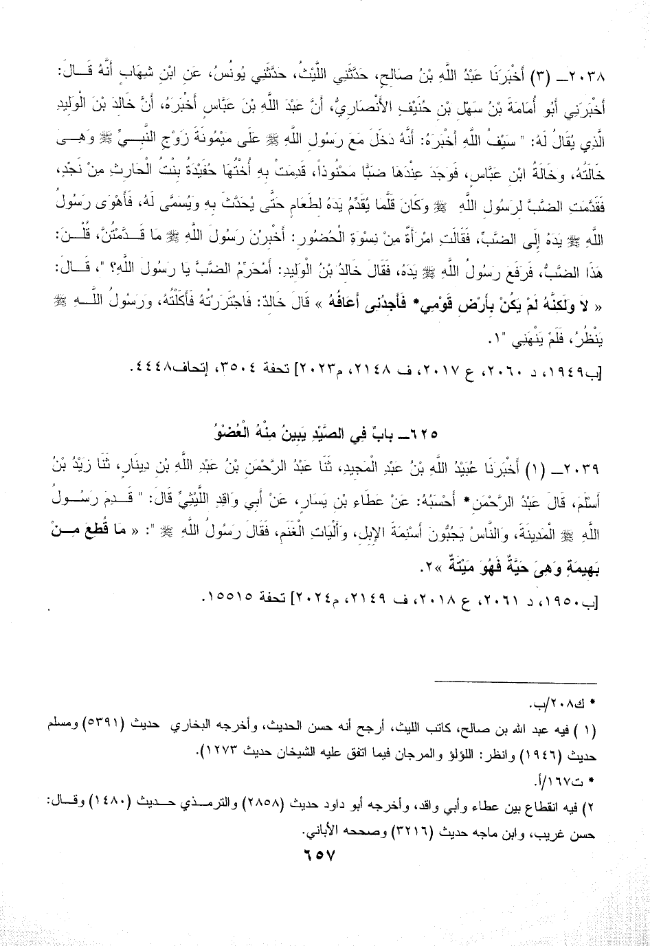 2038 - (3) أَخْبَرَنَا عَبْدُ اللَّهِ بْنُ صَالِحٍ، حَدَّثَنِي اللَّيْثُ، حَدَّثَنِي يُونُسُ، عَنِ ابْنِ شِهَابٍ أَنَّهُ قَالَ: أَخْبَرَنِي أَبُو أُمَامَةَ بْنُ سَهْلِ بْنِ حُنَيْفٍ الأَنْصَارِيُّ، أَنَّ عَبْدَ اللَّهِ بْنَ عَبَّاسٍ أَخْبَرَهُ، أَنَّ خَالِدَ بْنَ الْوَلِيدِ الَّذِي يُقَالُ لَهُ: " سَيْفُ اللَّهِ أَخْبَرَهُ: أَنَّهُ دَخَلَ مَعَ رَسُولِ اللَّهِ - صلى الله عليه وسلم - عَلَى مَيْمُونَةَ زَوْجِ النَّبِيِّ - صلى الله عليه وسلم - وَهِىَ خَالَتُهُ، وَخَالَةُ ابْنِ عَبَّاسٍ، فَوَجَدَ عِنْدَهَا ضَبًّا مَحْنُوذاً، قَدِمَتْ بِهِ أُخْتُهَا حُفَيْدَةُ بِنْتُ الْحَارِثِ مِنْ نَجْدٍ، فَقَدَّمَتِ الضَّبَّ لِرَسُولِ اللَّهِ - صلى الله عليه وسلم - وَكَانَ قَلَّمَا يُقَدِّمُ يَدَهُ لِطَعَامٍ حَتَّى يُحَدَّثَ بِهِ وَيُسَمَّى لَهُ، فَأَهْوَى رَسُولُ اللَّهِ - صلى الله عليه وسلم - يَدَهُ إِلَى الضَّبِّ، فَقَالَتِ امْرَأَةٌ مِنْ نِسْوَةِ الْحُضُورِ: أَخْبِرْنَ رَسُولَ اللَّهِ - صلى الله عليه وسلم - مَا قَدَّمْتُنَّ، قُلْنَ: هَذَا الضَّبُّ، فَرَفَعَ رَسُولُ اللَّهِ - صلى الله عليه وسلم - يَدَهُ، فَقَالَ خَالِدُ بْنُ الْوَلِيدِ: أَمُحَرِّمُ الضَّبَّ يَا رَسُولَ اللَّهِ؟ "، قَالَ: «لاَ وَلَكِنَّهُ لَمْ يَكُنْ بِأَرْضِ قَوْمِي* فَأَجِدُنِى أَعَافُهُ» قَالَ خَالِدٌ: فَاجْتَرَرْتُهُ فَأَكَلْتُهُ، وَرَسُولُ اللَّهِ - صلى الله عليه وسلم - يَنْظُرُ، فَلَمْ يَنْهَنِي " (¬1).