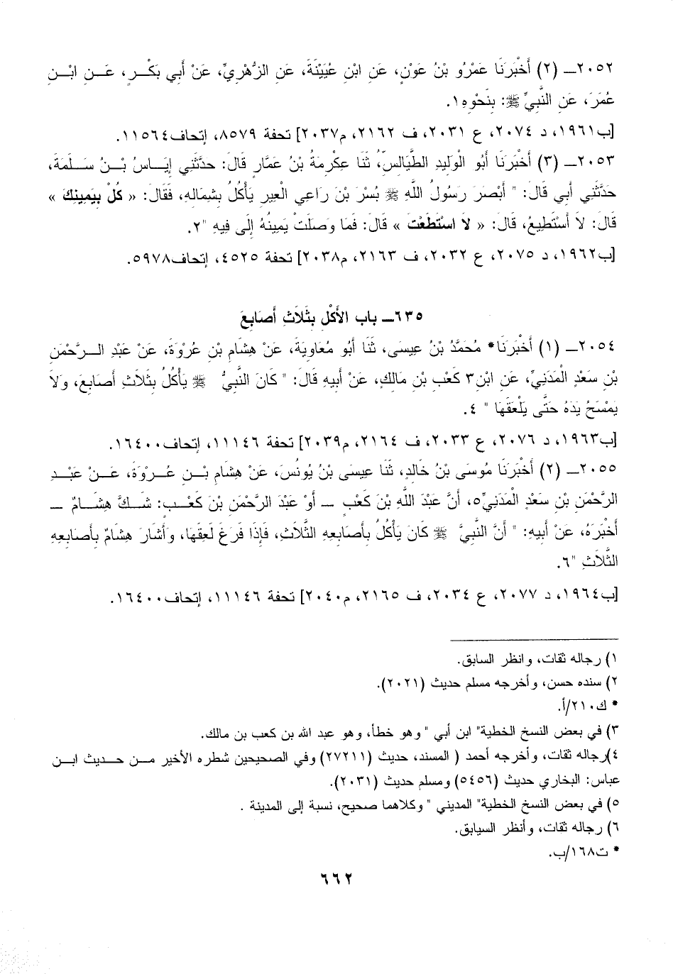 2055 - (2) أَخْبَرَنَا مُوسَى بْنُ خَالِدٍ، ثَنَا عِيسَى بْنُ يُونُسَ، عَنْ هِشَامِ بْنِ عُرْوَةَ، عَنْ عَبْدِ الرَّحْمَنِ بْنِ سَعْدٍ الْمَدَنِيِّ (¬5)، أَنَّ عَبْدَ اللَّهِ بْنَ كَعْبٍ - أَوْ عَبْدَ الرَّحْمَنِ بْنَ كَعْبٍ: شَكَّ هِشَامٌ - أَخْبَرَهُ، عَنْ أَبِيهِ: " أَنَّ النَّبِيَّ - صلى الله عليه وسلم - كَانَ يَأْكُلُ بِأَصَابِعِهِ الثَّلاَثِ، فَإِذَا فَرَغَ لَعِقَهَا، وَأَشَارَ هِشَامٌ بِأَصَابِعِهِ الثَّلاَثِ " (¬6).