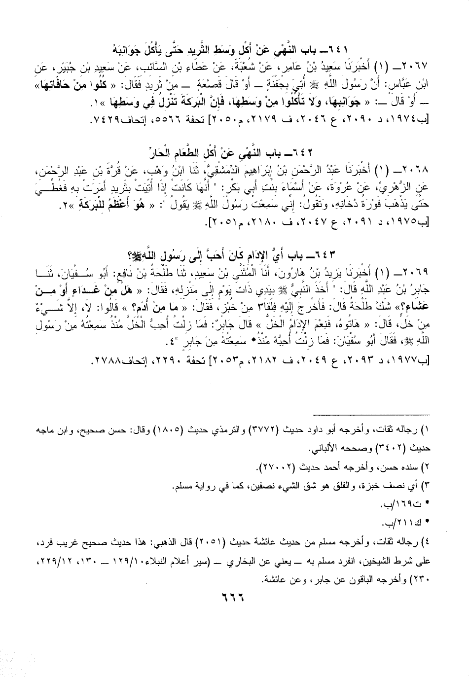 2069 - (1) أَخْبَرَنَا يَزِيدُ بْنُ هَارُونَ، أَنَا الْمُثَنَّى بْنُ سَعِيدٍ، ثَنَا طَلْحَةُ بْنُ نَافِعٍ: أَبُو سُفْيَانَ، ثَنَا جَابِرُ بْنُ عَبْدِ اللَّهِ قَالَ: " أَخَذَ النَّبِيُّ - صلى الله عليه وسلم - بِيَدِي ذَاتَ يَوْمٍ إِلَى مَنْزِلِهِ، فَقَالَ: «هَلْ مِنْ غَدَاءٍ أَوْ مِنْ عَشَاءٍ؟ » شَكَّ طَلْحَةُ قَالَ: فَأَخْرَجَ إِلَيْهِ فِلَقاً (¬3) مِنْ خُبْزٍ، فَقَالَ: «مَا مِنْ أُدْمٍ؟ » قَالُوا: لاَ، إِلاَّ شَيْءٌ مِنْ خَلٍّ، قَالَ: «هَاتُوهُ، فَنِعْمَ الإِدَامُ الْخَلُّ» قَالَ جَابِرٌ: فَمَا زِلْتُ أُحِبُّ الْخَلَّ مُنْذُ سَمِعْتُهُ مِنْ رَسُولِ اللَّهِ - صلى الله عليه وسلم -، فَقَالَ أَبُو سُفْيَانَ: فَمَا زِلْتُ أُحِبُّهُ مُنْذُ* سَمِعْتُهُ مِنْ جَابِرٍ " (¬4).