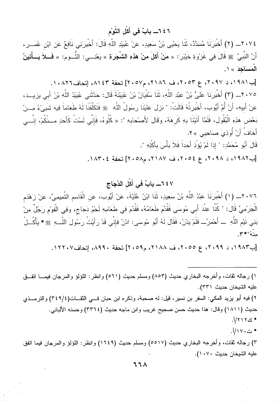 2074 - (2) أَخْبَرَنَا مُسَدَّدٌ، ثَنَا يَحْيَى بْنُ سَعِيدٍ، عَنْ عُبَيْدِ اللَّهِ قَالَ: أَخْبَرَنِي نَافِعٌ عَنِ ابْنِ عُمَرَ، أَنَّ النَّبِيَّ - صلى الله عليه وسلم - قَالَ فِي غَزْوَةِ خَيْبَرَ: «مَنْ أَكَلَ مِنْ هَذِهِ الشَّجَرَةِ» يَعْنِي: الثُّومَ: «فَلاَ يَأْتِيَنَّ الْمَسَاجِدَ» (¬1).