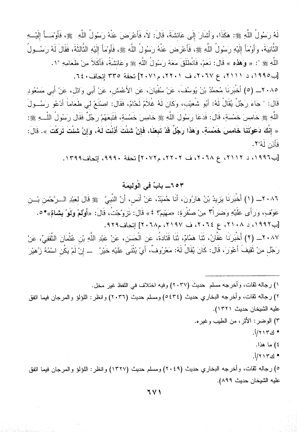 2086 - (1) أَخْبَرَنَا يَزِيدُ بْنُ هَارُونَ، أَنَا حُمَيْدٌ، عَنْ أَنَسٍ، أَنَّ النَّبِيَّ - صلى الله عليه وسلم - قَالَ لِعَبْدِ الرَّحْمَنِ بْنِ عَوْفٍ، وَرَأَى عَلَيْهِ وَضَراً (¬3) مِنْ صُفْرَةٍ: «مَهْيَمْ؟ (¬4)» قَالَ: تَزَوَّجْتُ، قَالَ: «أَوْلِمْ وَلَوْ بِشَاةٍ» * (¬5).
